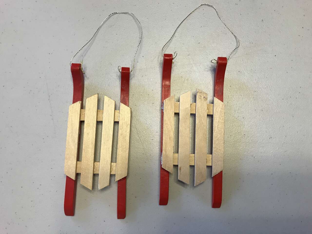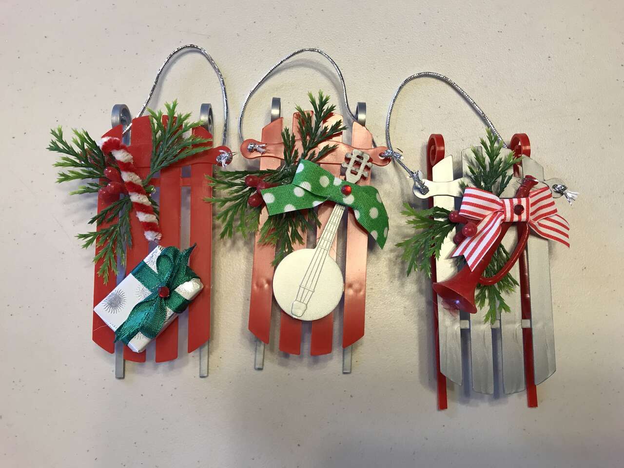 Lot of 8, Picture 15 - Dept 56 Santa Ornament Rustic Tin Spring Spiral Icicle, and Pictures 16 - 18 - 2 Wood Trees with a Bear in each, 2 Wood Sleds, & 3 Plastic Decorated Sleds, $10.00