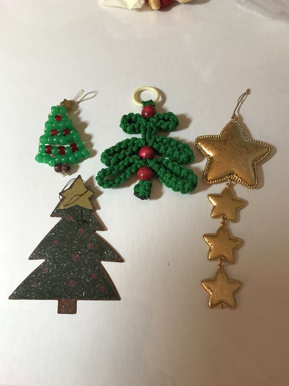 Picture 21 - 24 - 12 different ornaments, birds, snowman, snowflake, Joy, red bell, Mary and Baby Jesus silver, Yarn wrapped Candy Cane, 3 trees, 1-4 hanging stars, Hands do what hearts feel..., $10.00