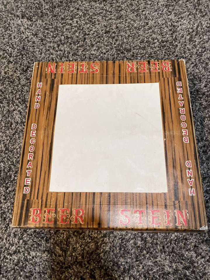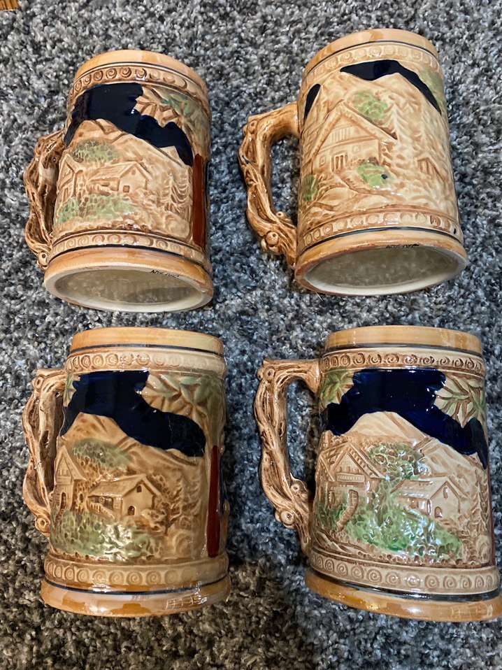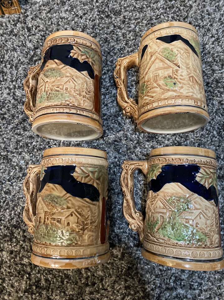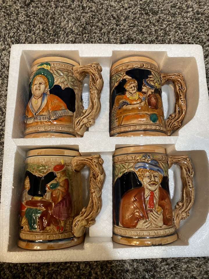 Nice collection of vintage beer steins, in the original box. Great detail, really beautiful pieces, made in Japan. Steins are in great shape and appear to be unused.