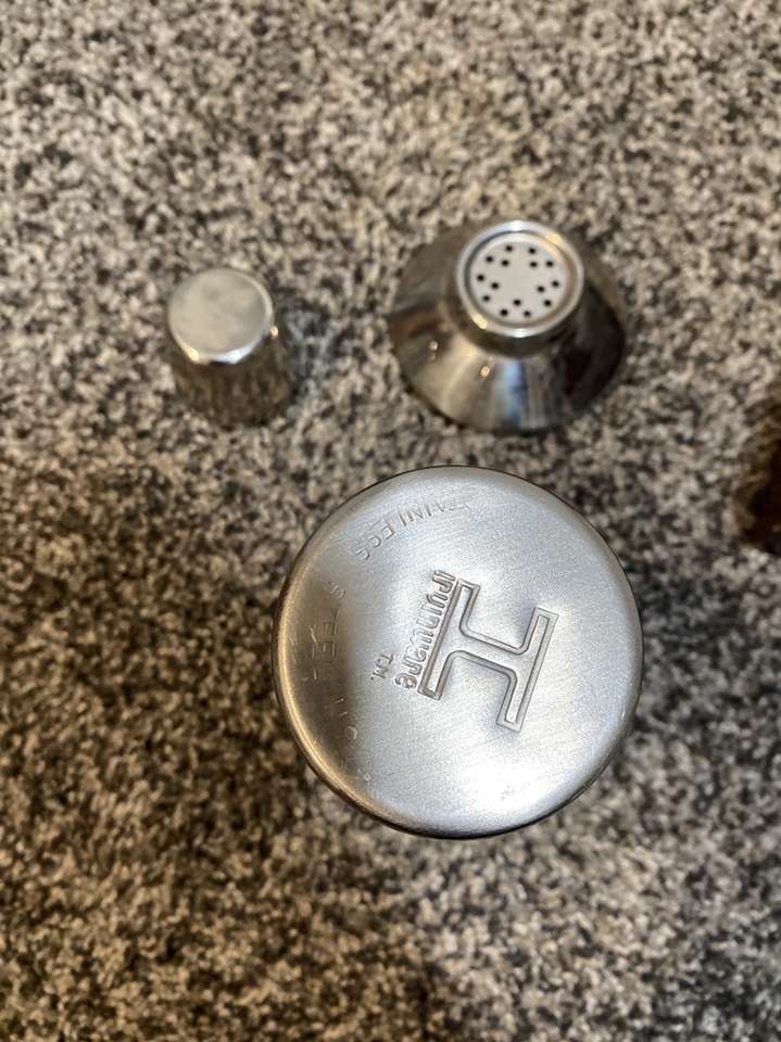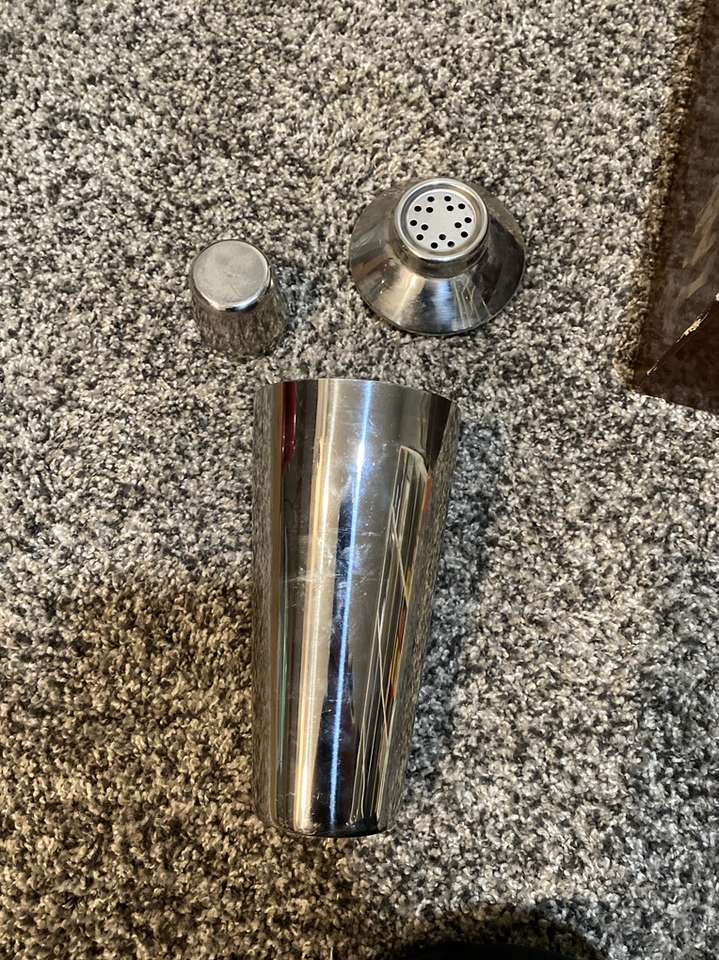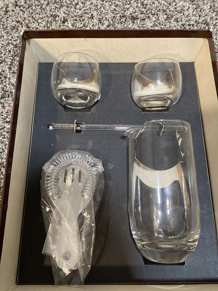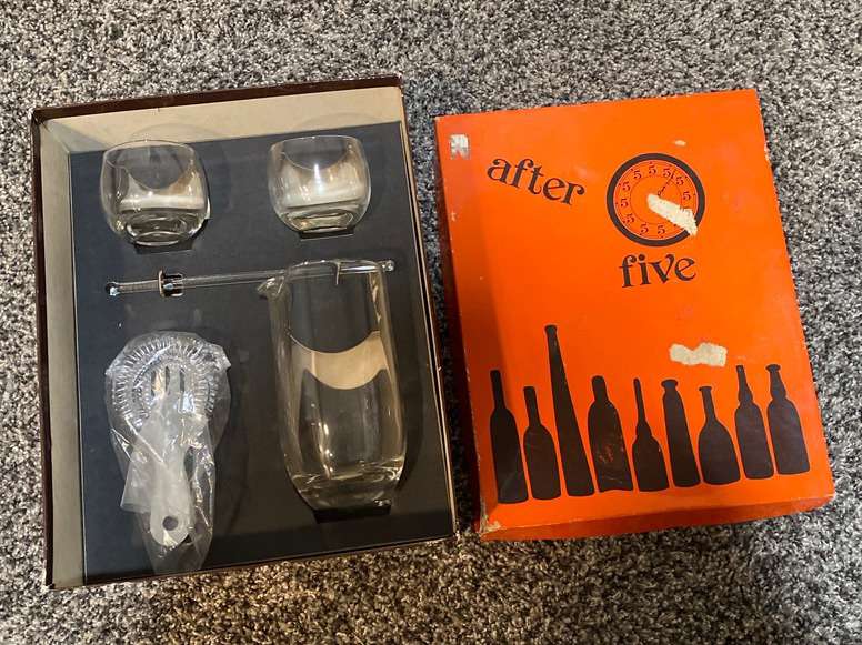 After 5 Brand Continental Martini Set Mark VIII in original box, appears unused. Also includes an Irvinware 3 piece stainless steel cocktail shaker.