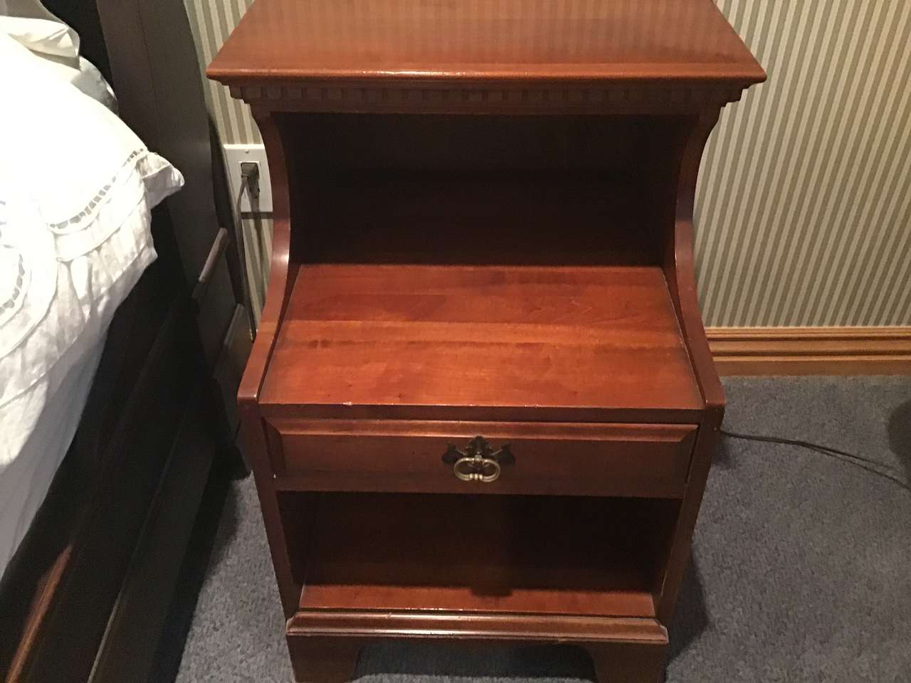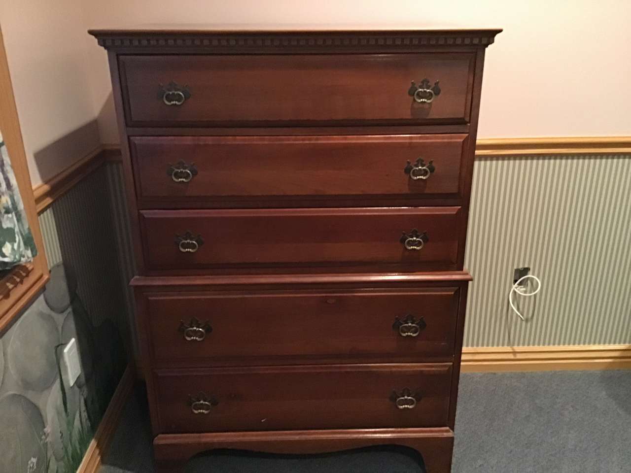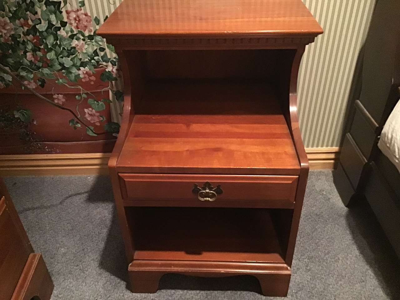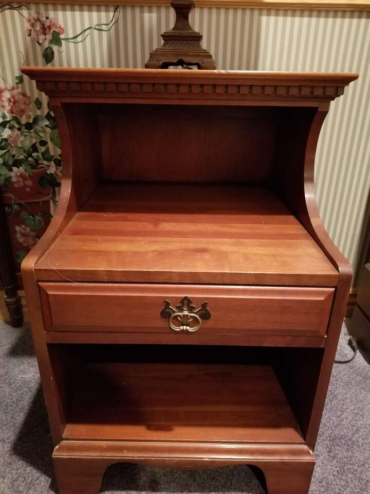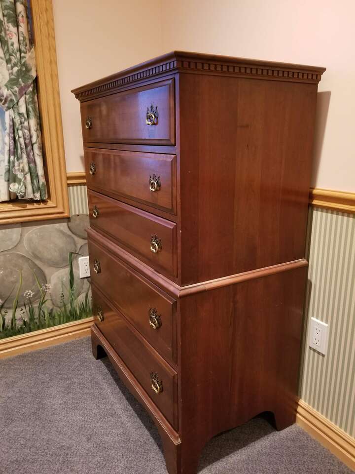 Mid-Century Davis Cabinet Company 9-piece Solid Cherry Bedroom Full/Queen Set! Sold as set! Quality! "Tawny Cherry" Made in Nashville,Tennessee! Quality! 9 drawer dresser & mirror. (Dresser) 58"X20X33.5" (Mirror) 45"X37", 5 drawer upright dresser. 35"X20"X49", Head board. 56"X46", Foot board! 56"X28", 2 side boards. 76" long, 2 night stands with drawer. 20"X19"X28". Call Doug for details- 801-949-9415.