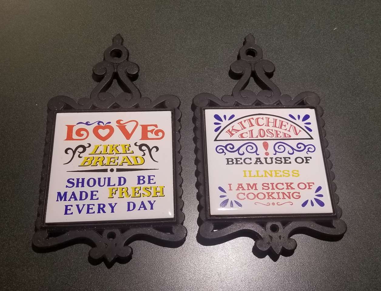 These are cute hot pads for your kitchen. Made with a tile in cast iron. There is a small chip on the top of one of them. See picture. Pick up in Layton. No holds or deliveries.
