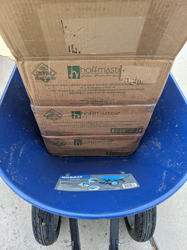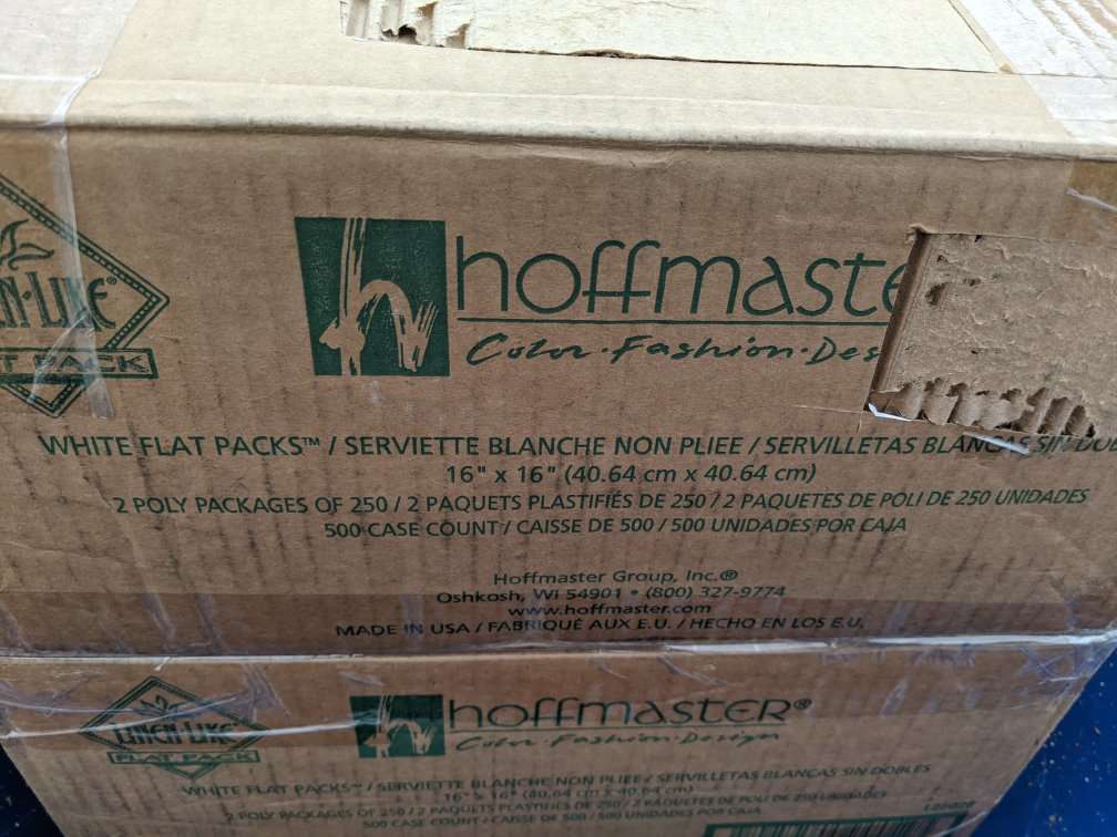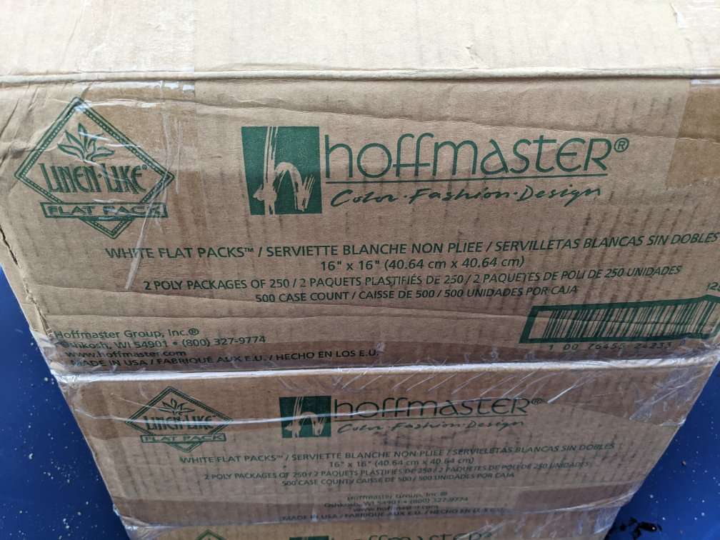 16 in x 16 in White Linen-Like Flat Pack Dinner Napkins white 500 pack Located in Riverton Cash Venmo Retails for $93 Have 3 cases all 3 for $150 or 60 each case Select a superb-quality napkin that's also disposable with help from our 16" x 16" White Linen-Like Flat Pack Dinner Napkins. These premium napkins are thick and soft, look like real linen, and will last an entire meal. These 16" square napkins arrive flat, which means you can fold them any way you wish. The crisp white color will complement any setting. Grab these for your restaurant, catering business, or event today!
