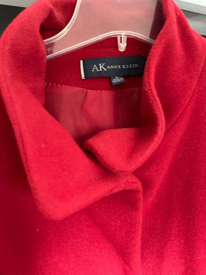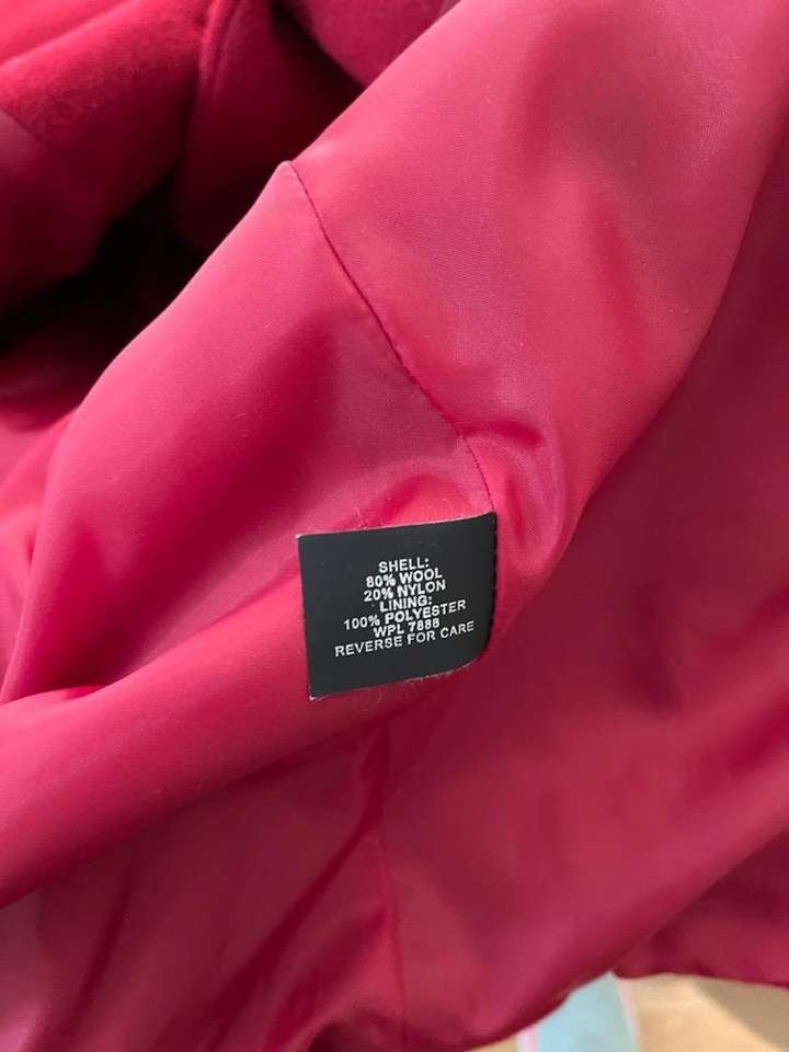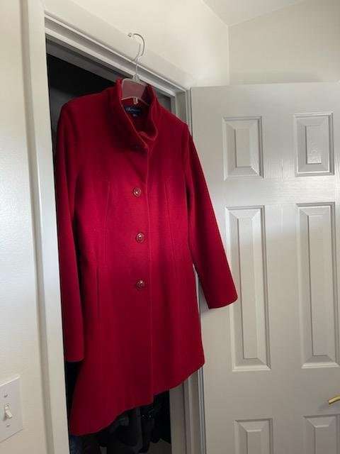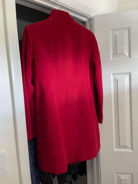 Very nice high end coat. Deep red or Scarlet color. Very gently used. The material is 80% wool 20% Nylon. CHECK OUT MY OTHER ADS! FEEL FREE TO MAKE OFFERS ON ANY OR ALL OF MY ADS. THANKS FOR LOOKING.