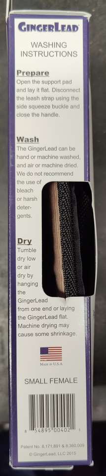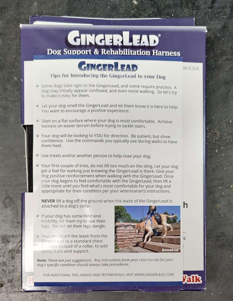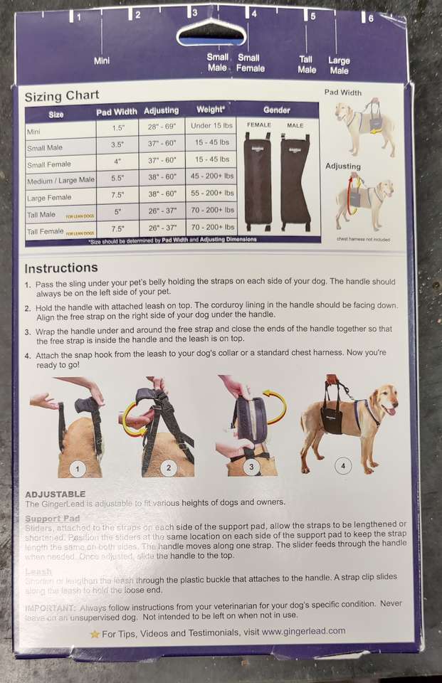 Product Information: FEATURES – No Bunching - Padded for Comfort - Integrated Leash - Adjustable for Height - Easy to Use - Soft Corduroy Lining MACHINE WASHABLE AND DRYABLE – The superior quality and durability of the Ginger Lead is preserved after machine washing and drying. Proudly MADE IN U.S.A. USED IN VETERINARY HOSPITALS - Ginger Leads are used by veterinarians throughout the United States. Recommended for recovery from TPLO / cruciate, hip, IVDD or back surgery, physical therapy, to assist senior dogs suffering from arthritis, degenerative myelopathy or vestibular disease, and disabled pets needing help with mobility or balance. SIZING - Support pad is 4” wide x 17” long. Sling length adjusts from 37" - 60" long, so you remain upright while supporting your pup. Please measure to ensure the proper fit. OUR INSPIRATION – The experiences helping our 6 month old Golden Retriever puppy, Ginger, recover from reconstructive hip surgery for severe hip dysplasia, then knee surgery a few years later, was the inspiration for our patented design. The Ginger Lead harness was a lifesaver again when Ginger was old and needed help up and down stairs, and out for walks.
