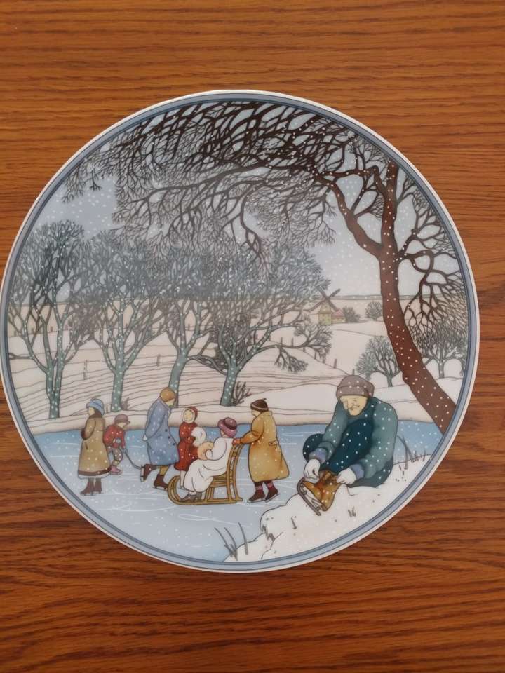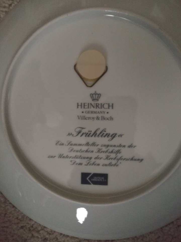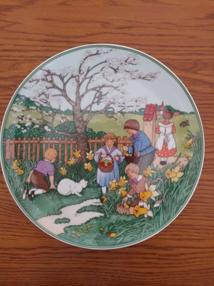 A set of 4 German Heinrich Villeroy and Boch "Seasons" plates. Inscription on the backside of each plate. There is a slight fracture on the back of the winter plate that was sealed that didn't impair the scene on the front of the plate. The set of 4 sells for $120. The Easter plate is like new. It sells for $25.00. Willing to negotiate price. Cash only please.