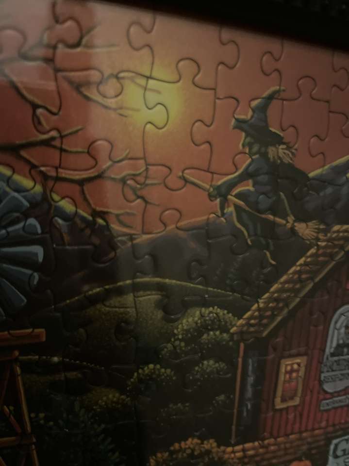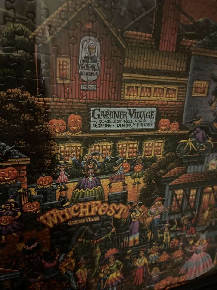 This black framed puzzle is from Gardner Village “WitchFest.” It is a colorful village puzzle that measures 19X24 inches at the outside of the frame. It is in excellent condition.