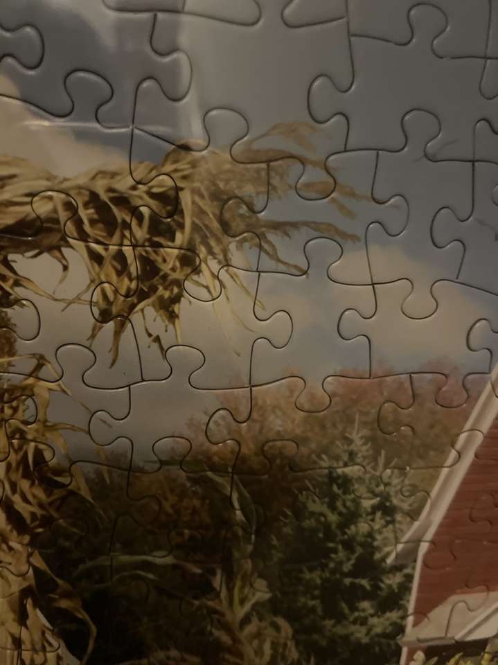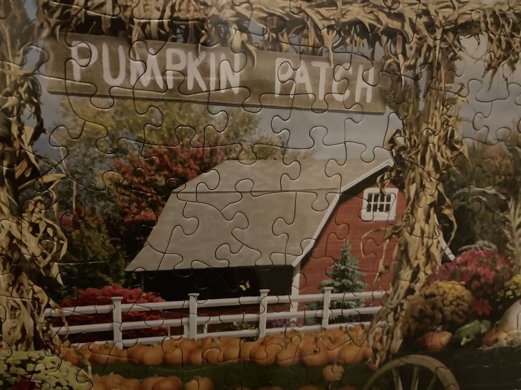 The black framed Pumpkin Patch puzzle measures 22X28” and is a classic fall scene with pumpkins, barns and beautiful fall colors. It is in excellent condition.