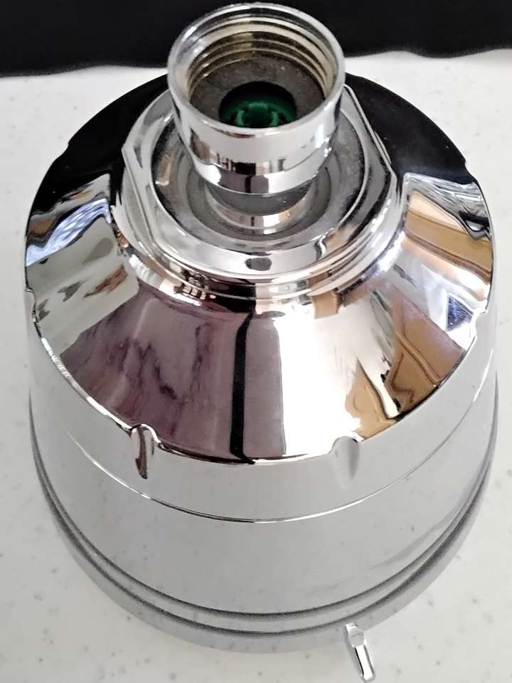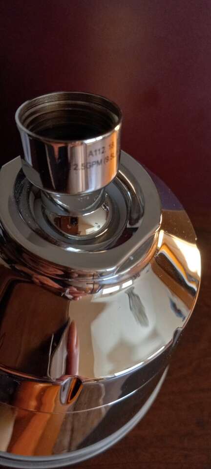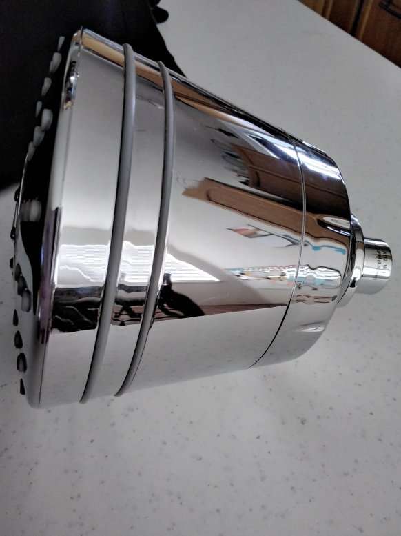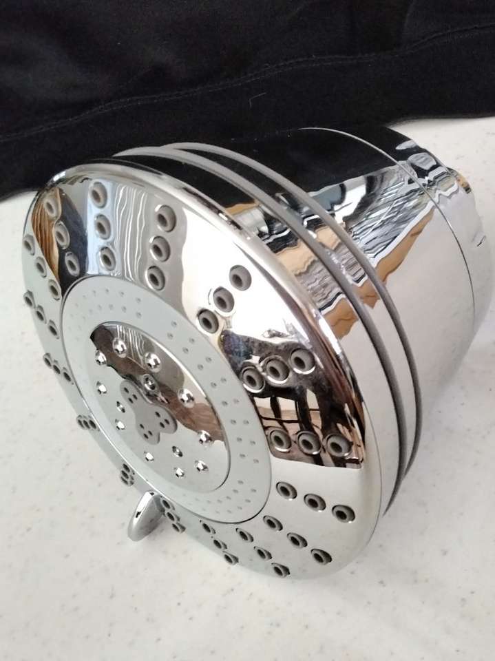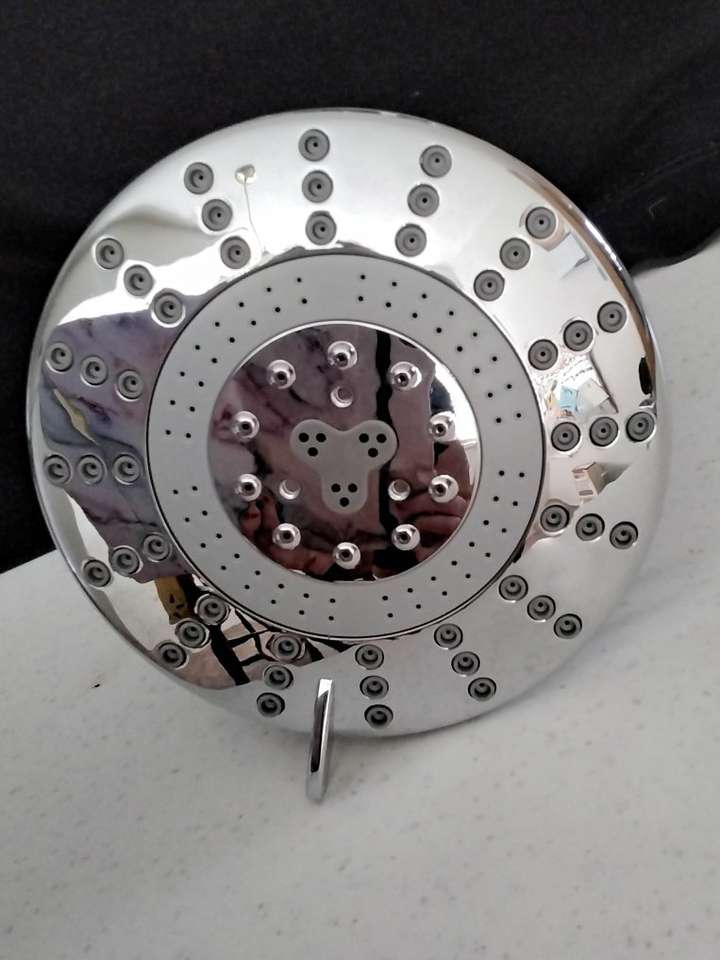 Heavy duty shower head. 4 different speeds approximately 5 x 5 round approximately 5 1/2 depth. Rubber garment for no slip, $10
