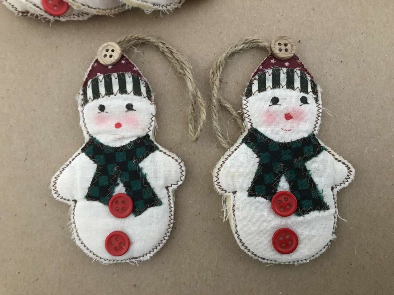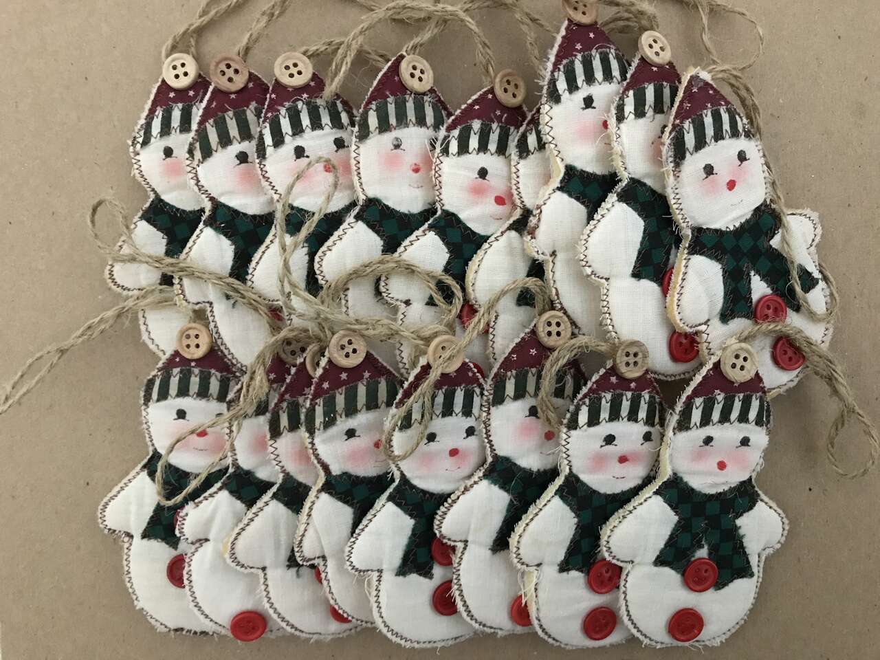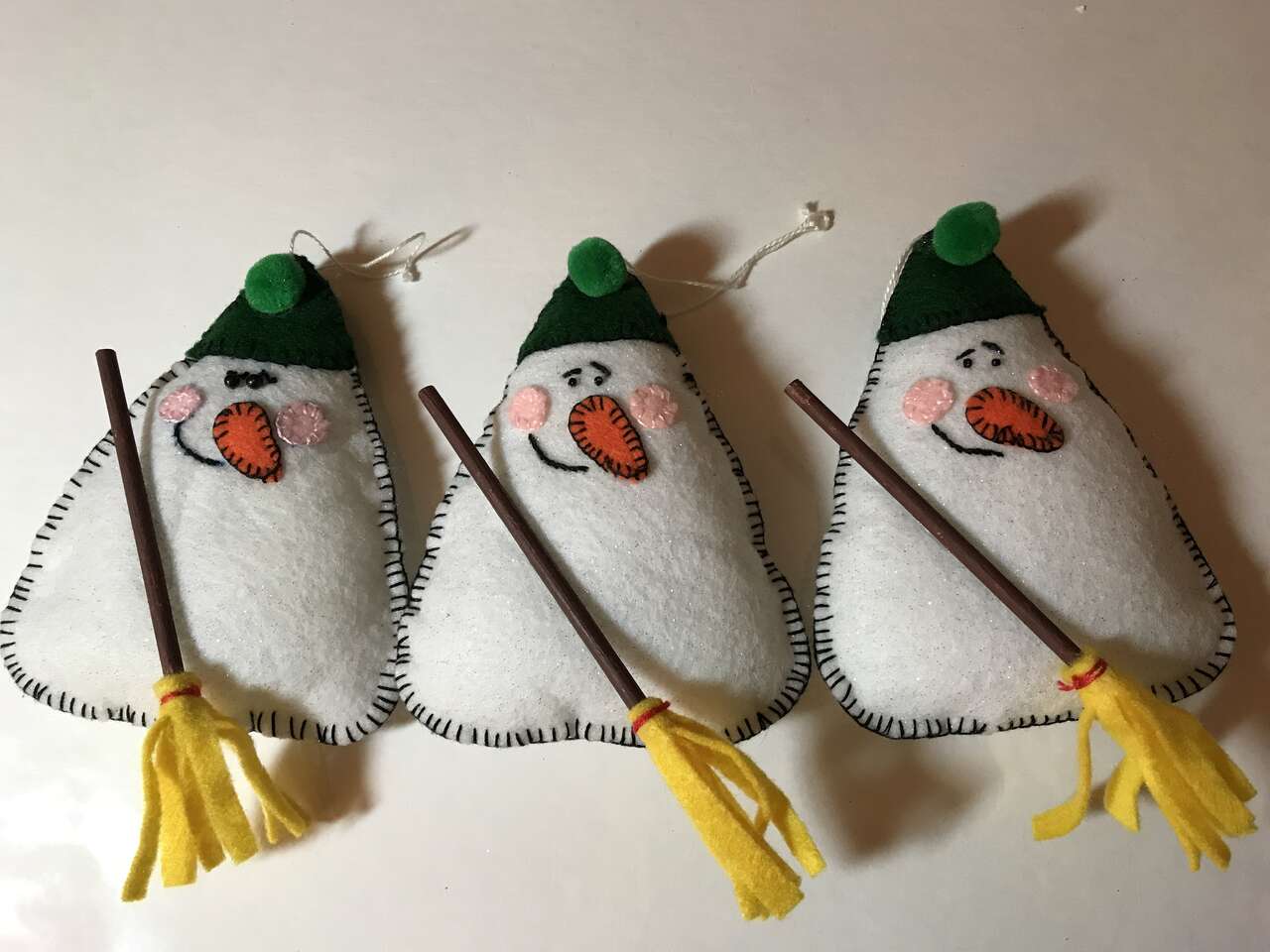 Pictures 13-14 - 34 are available. If you purchase 30 ornaments recieve the last 4 for free. Felt Snowmen Stuffed, Handmade, 5"x4", Used but in excellent condition. 10 for $10.00, Only 3 pictured.