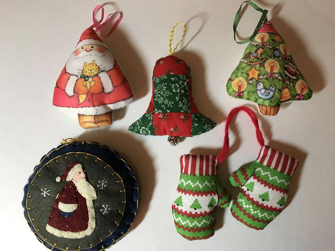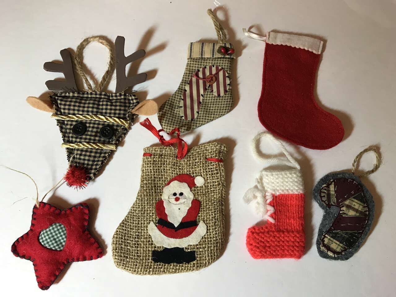 Pictures 33-35 - Lot of 14, 5 Stuffed handmade ornaments, 7 includes deer, star, 6 stockings and 1 Candy Cane, $10.00