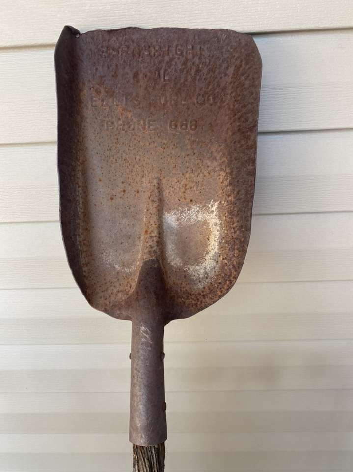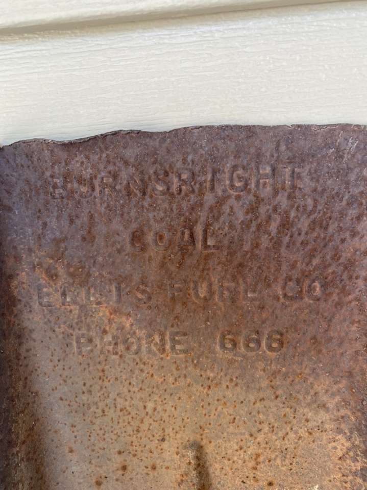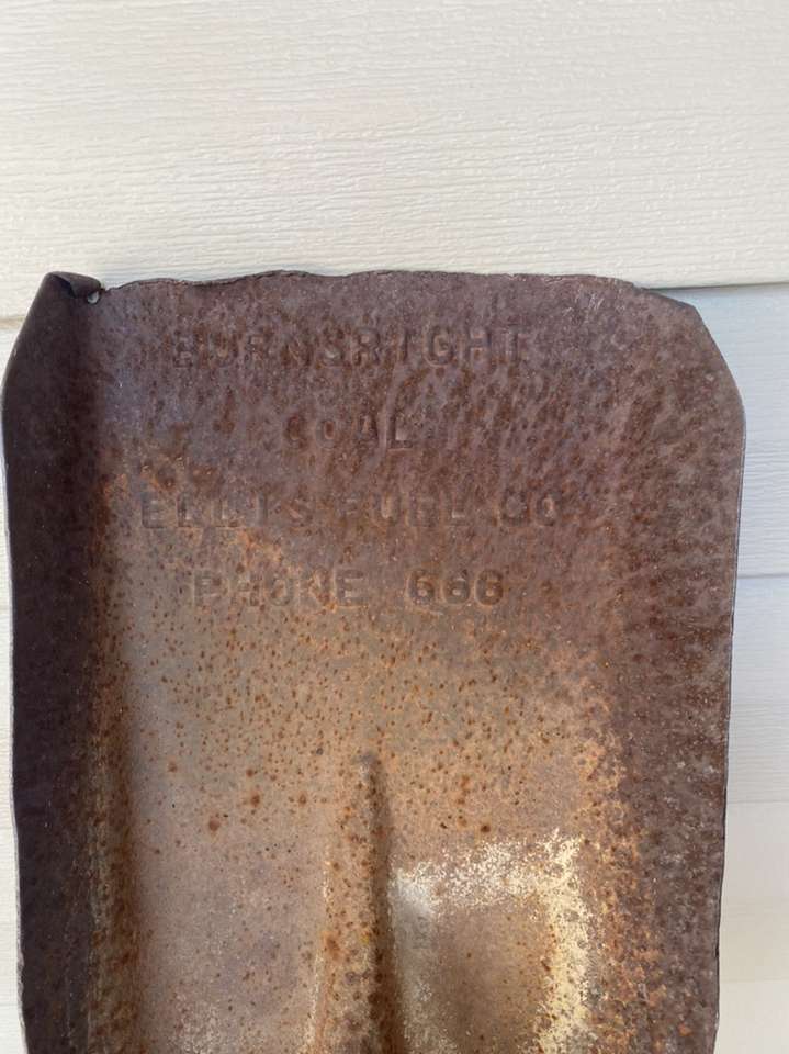 BURNSRIGHT COAL ELLIS FUEL CO PHONE 666. THIS IS THE INSIGNIA THAT IS EMBOSSED ON SHOVEL, VERY OLD, LATE 1800s EARLY 1900s MINERS SHOVEL. GREAT SHAPE.