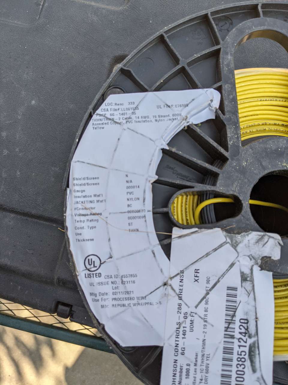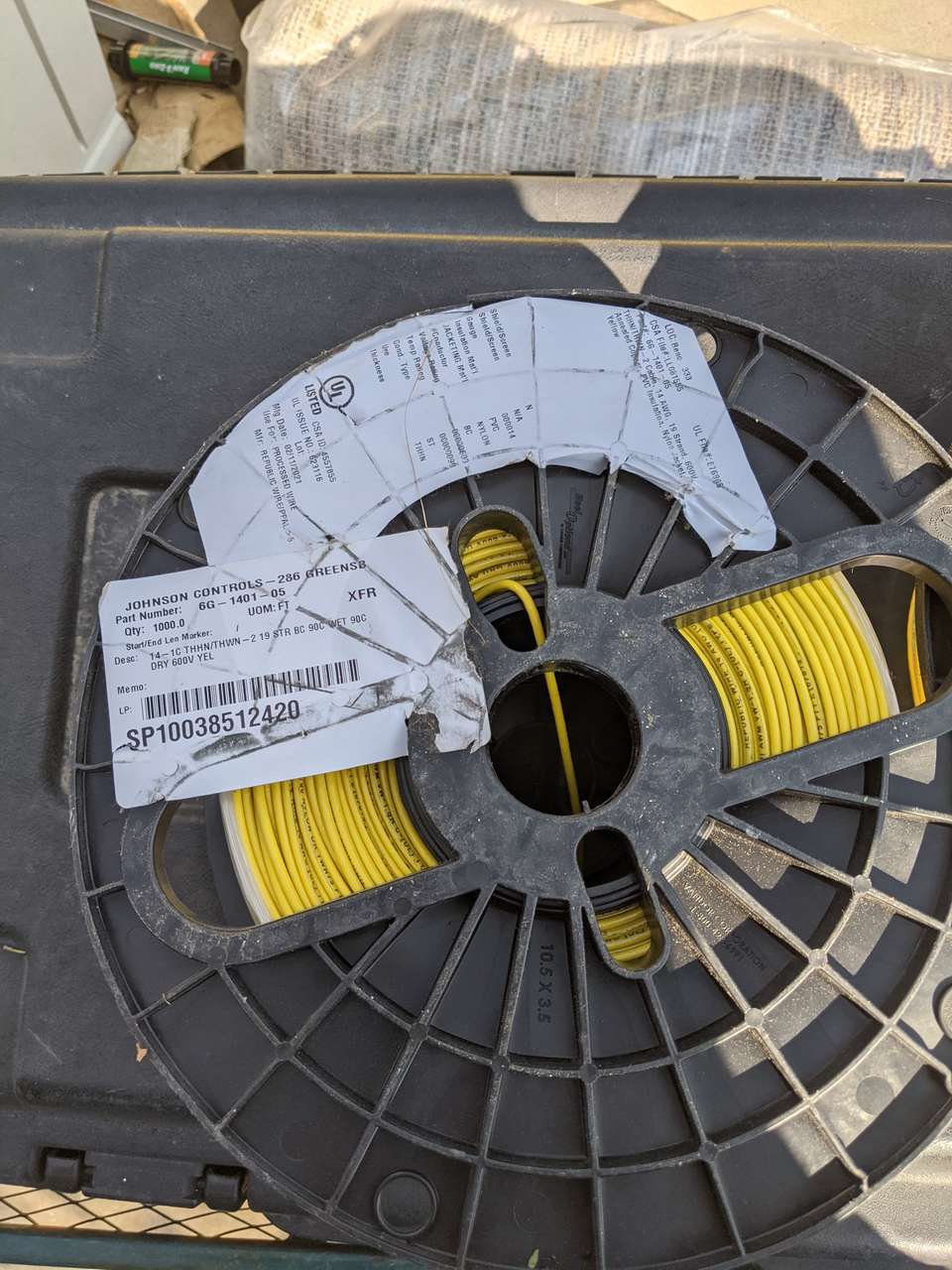 Located in South Jordan Cash / Venmo Retails $ 123 1000 feet I have 1 rolls left THHN/THWN-2 Product Description stranded PVC insulation Nylon jacket 90°C dry (THHN) 90°C wet (THWN-2, 8 AWG and larger) 75°C wet (THWN) 600 V Applications General purpose wiring for new construction or modernizing existing systems. Suitable for lighting and power in residential, commercial and industrial buildings. Also recommended for power control circuits, machine tools, appliances and relay panels. The overall nylon jacket is abrasion resistant with slippery surface, for easy pulling in conduits. Highly resistant to acids, alkalis, chemicals, oil, gasoline, grease and flame. Specifications – CONDUCTOR: Solid or stranded annealed copper per applicable ASTM standard – INSULATION: Polyvinyl Chloride (PVC) sheathed with nylon meeting the requirements of the applicable UL standard – STANDARDS: UL 83 Thermoplastic Wire and Cable, UL 1063 MTW, UL 758 AWM, Federal Specification A-A-59544. Sizes 1/0 and larger are marked "for CT use". Cable is sunlight-resistant in 1/0 and larger (black only) – AMPACITY: Based on not more than three conductors in raceway or cable or earth with an ambient temperature of 30°C per 2008 NEC Table 310.16 – TEMPERATURE: THHN 90°C dry, THWN-2 90°C wet/dry, THWN 75°C wet, MTW 90°C dry, 60°C wet/oil, AWM 105°C dry – VOLTAGE: 600 V