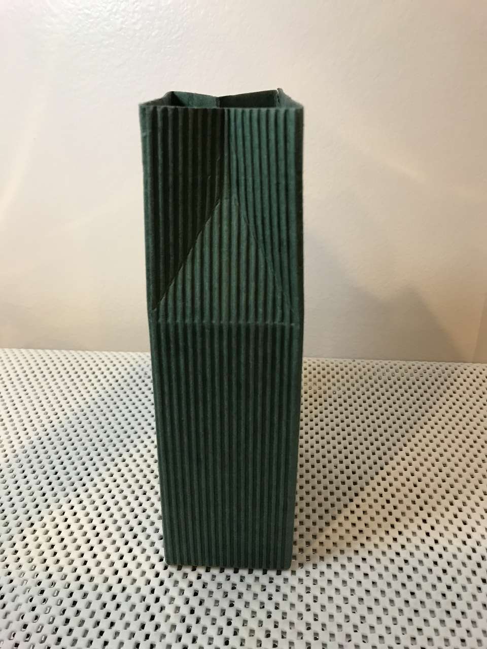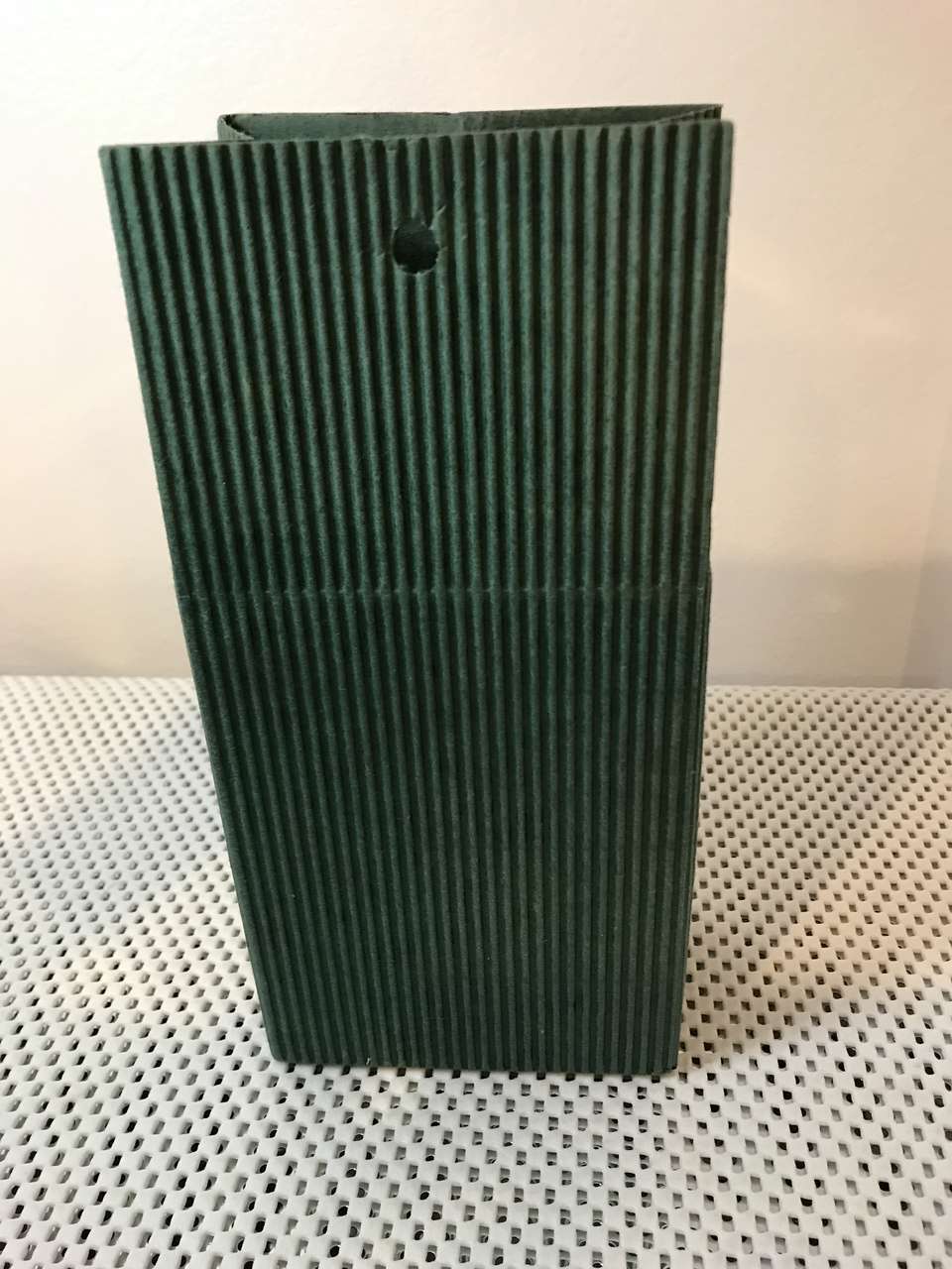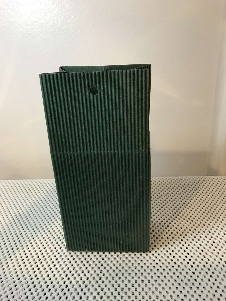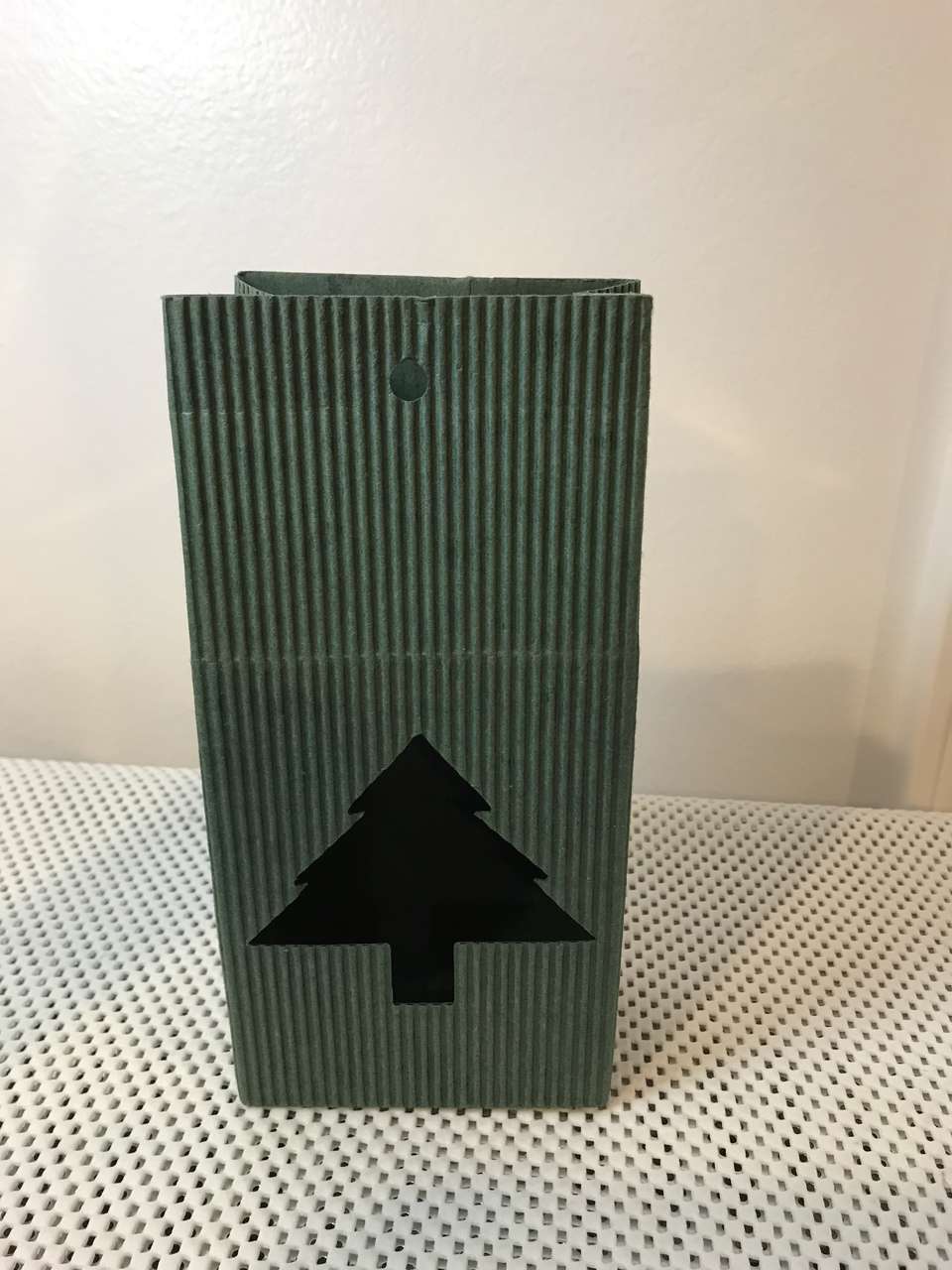 Corrugated Forest Green Paper Bag w/tree Window, 8" H x 2 1/2 D x 4" W. Can be used to display an LED candle or put a clear cellophane sheet inside and fill with goodies, foldable bag, free with either purchase above.