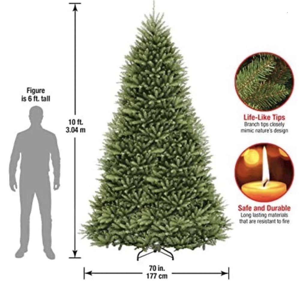 New in Box—NATURAL LIFELIKE APPEAL: Artificial branches look ultra-realistic and lifelike. With 5,090 individually crafted branch tips, this full bodied tree is as charming as the real thing. SIMPLE SETUP AND STORAGE: Convenient hinged branches allow for easy setup and disassembly. LASTING DURABILITY: Built to endure many holidays with its sturdy metal base, our time-tested needles are also fire resistant and non-allergenic. IDEAL SIZING: Tree stands 10 feet tall and 70 inches in diameter at the base. For its most lush and full form, plan on taking 60-90 minutes to shape the tree.