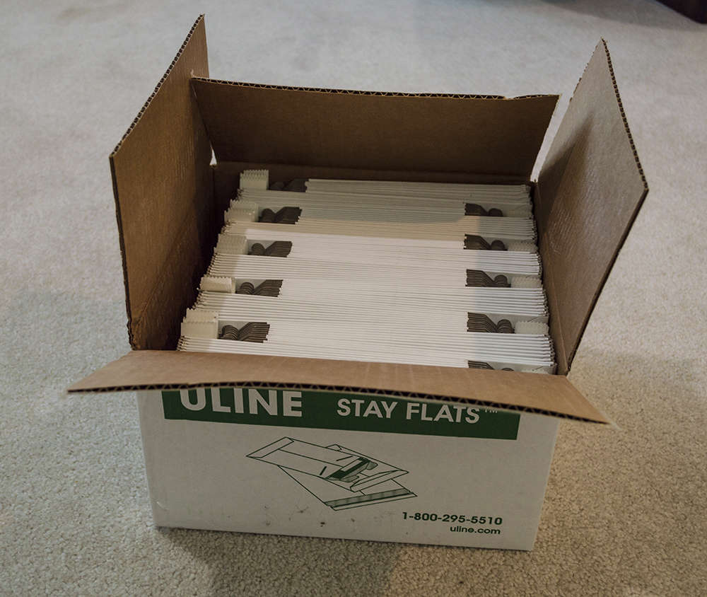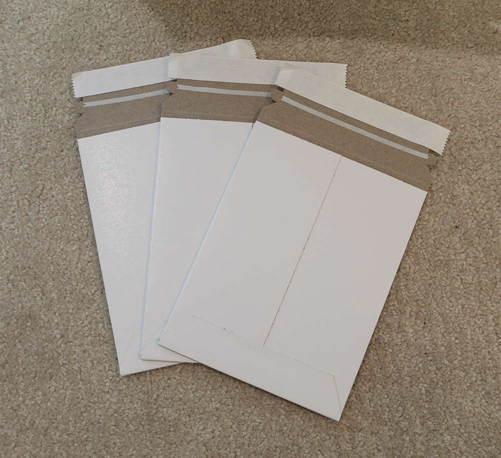 These are nice thick 6x8 inch self-sealing mailers. Made from about 0.6-0.7 mm thick white chipboard. 100 in original box.