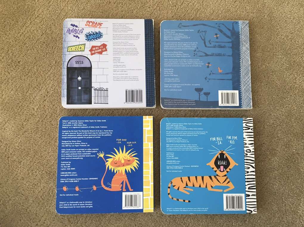 Four BabyLit board books, by Jennifer Adams, illustrated by Alison Oliver. Sherlock Holmes: The Hound of the Baskervilles, Jane Eyre, The Wonderful Wizard of Oz, and The Jungle Book. 5” x 5” (the smaller size). Good condition—some wear on edges (see photos). Text if interested. Cash or Venmo. Discount on multiple items.