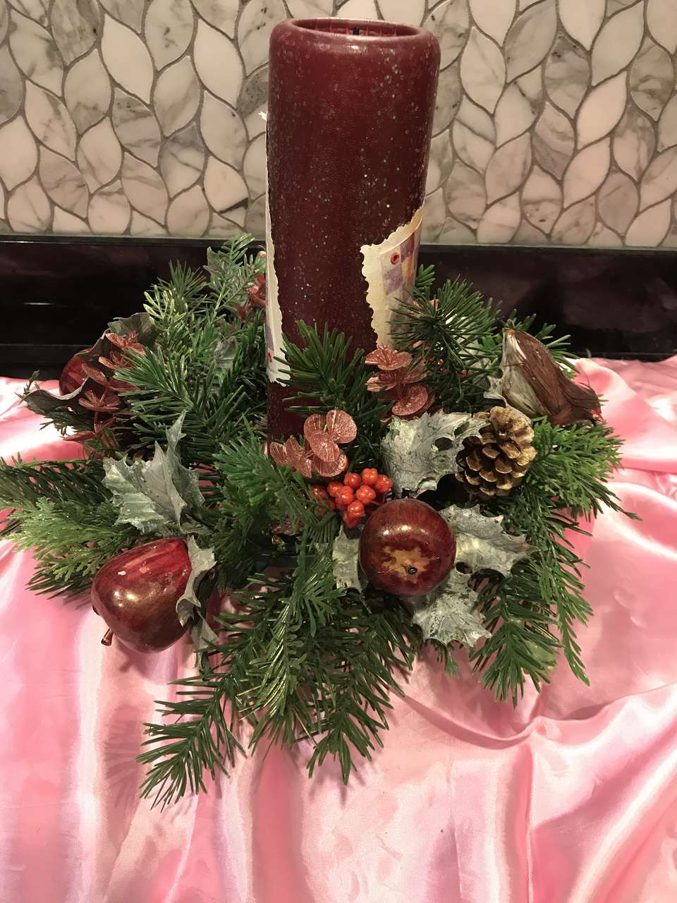 VenmoHOLIDAY WREATH with PARTRIDGE, APPLES, BERRIES, PINECONES. HOLLY LEAVES. 16 inches across. 8 inch center circle with handing hole. Pine needles are lightly frosted with gold paint for added luster. See All 6 Photos for more details. Hang on door or use as a centerpiece. (candle not included). $5 Cash/Venmo. In Sandy. 801-201-5350. Brass Candle Centerpiece also available under seller #427883