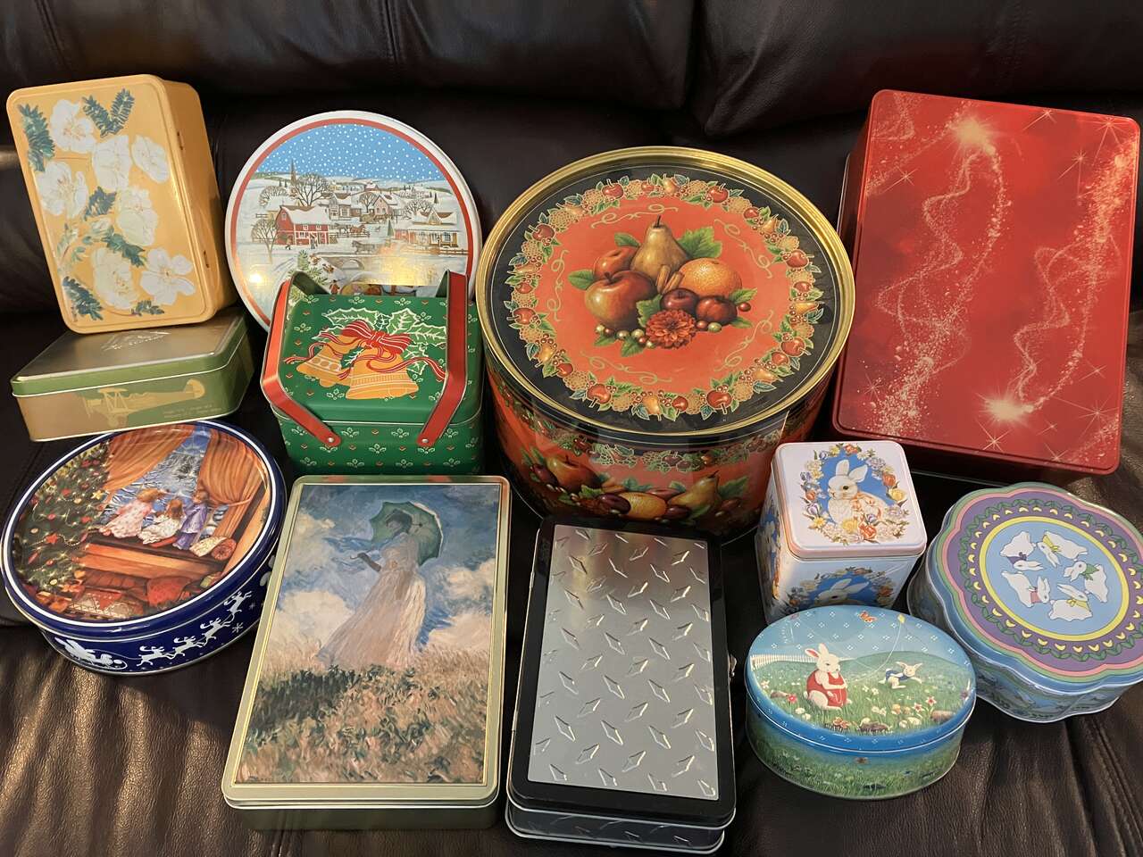 VenmoCHRISTMAS & EASTER & MISC TINS, FRUIT TIN 13.5-inch x 10.5 inch x 4.5 inch tall Pears design $4. (see all three photos for more options) Two round tins 7.5 inch and 8.5 inch $1 each. 10.5 inch by 6.5 inch deep round $3(SOLD). Green tin with 2 handles $3. Red & Gold Rectangle tin $3. Yellow rectangle w/white flowers. $2(SOLD). Silver/Black Rectangle $3. Square Silver Tin w/airplanes $1. 3 Easter Tins $10. Photo of other tin has sold. Cash/Venmo. In Sandy. 801-201-5350.