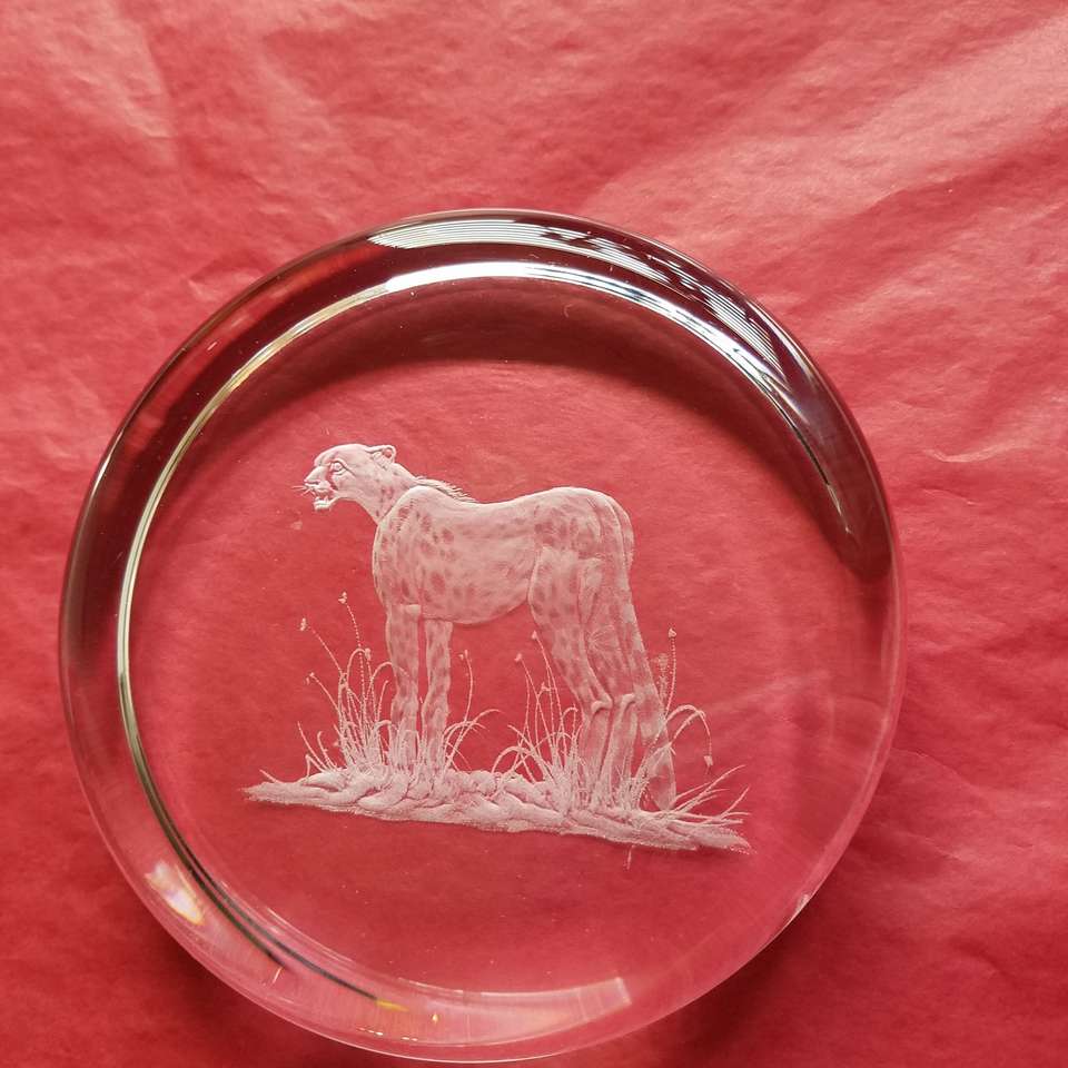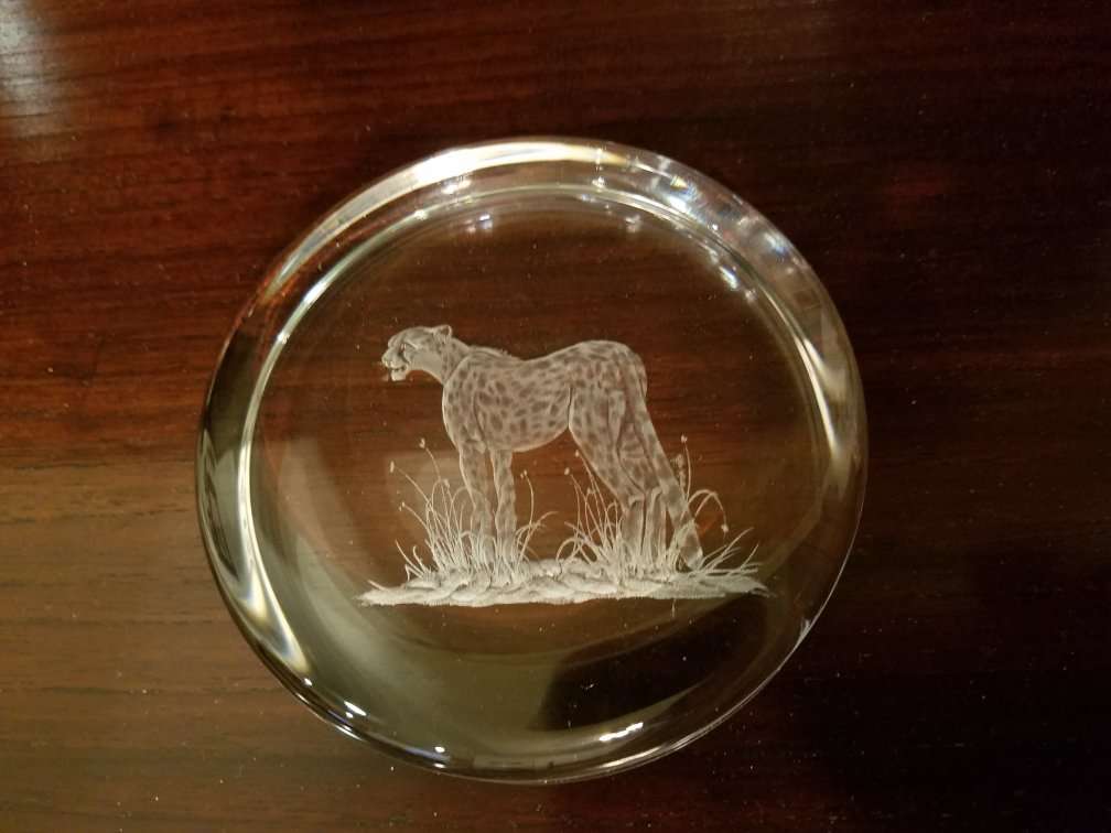 This paperweight of a cheetah is beautiful, and measures 3 1/2 inches in diameter, and is 5/8 inches high. If you measure around the circle, it is 11 inches. Fairly heavy. Excellent condition. If you have a runner in your family, and they are FAST, this paperweight is the perfect gift as cheetahs run very fast. Just reduced price by $10..