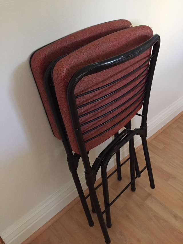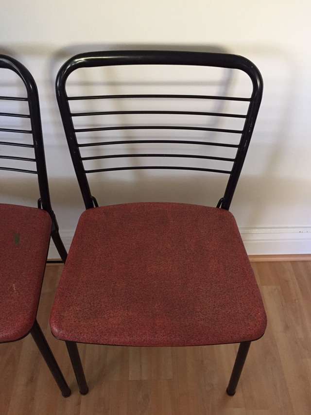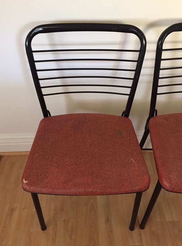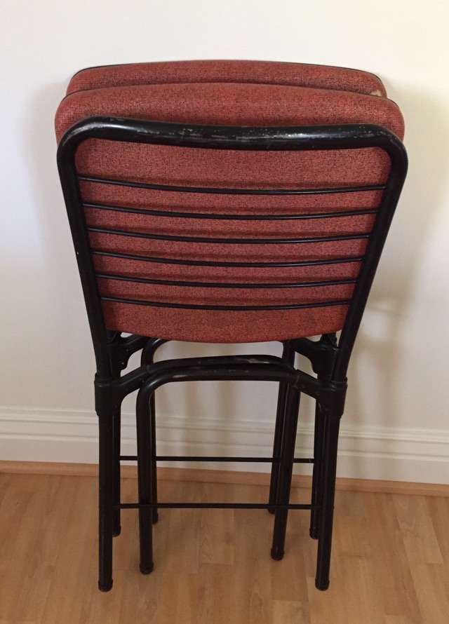 VenmoFabulous folding chairs from the 1950s! Vinyl and metal and in a rare color that is super cool and very hard to find. One Cosco Hamilton tag is still intact. There’s some typical wear. They are functional, sleek and sturdy. Very cool vintage pieces! $120 for the pair.