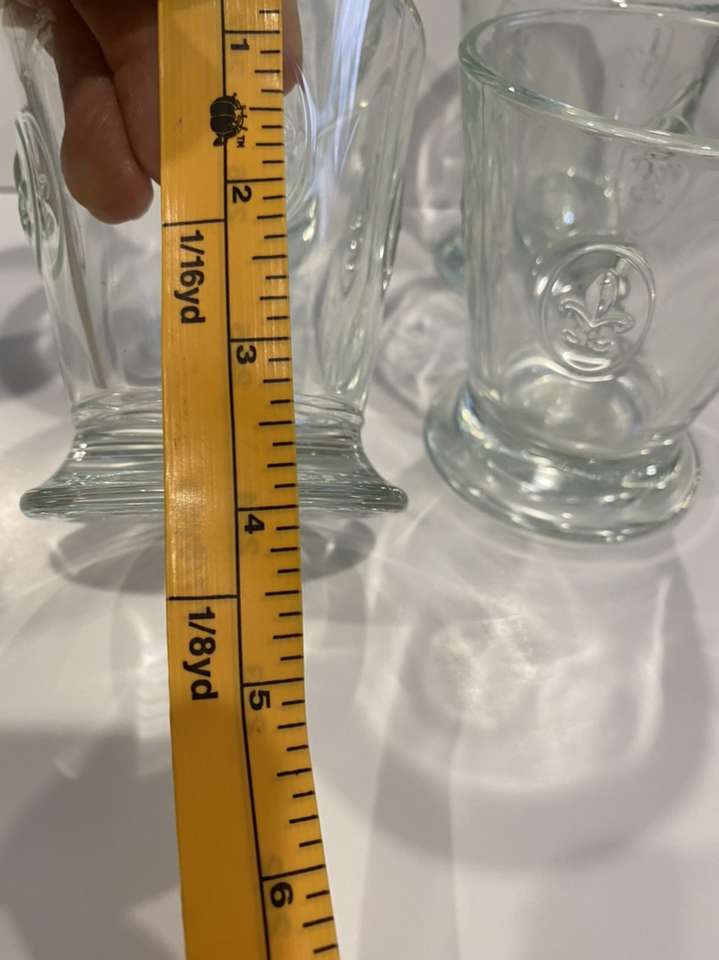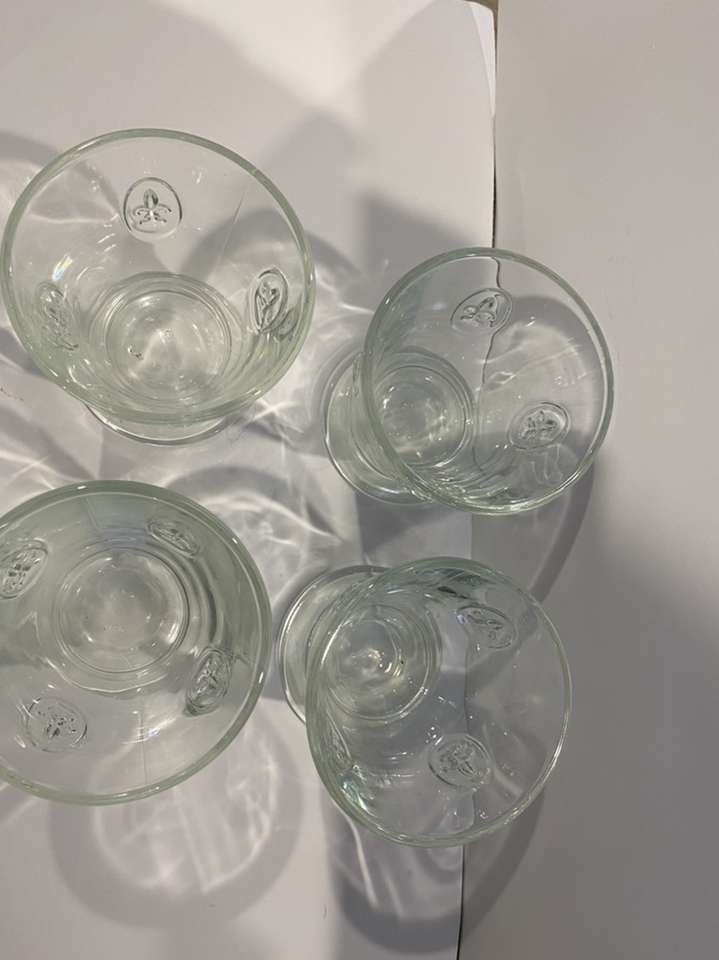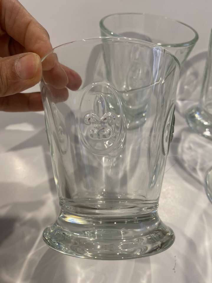 4” tumbler glasses with flier de lis embossed on glass, made in france