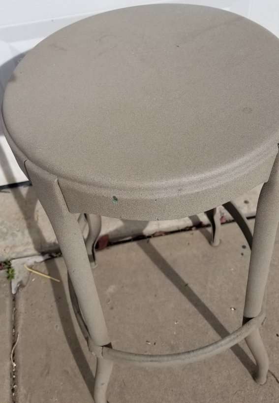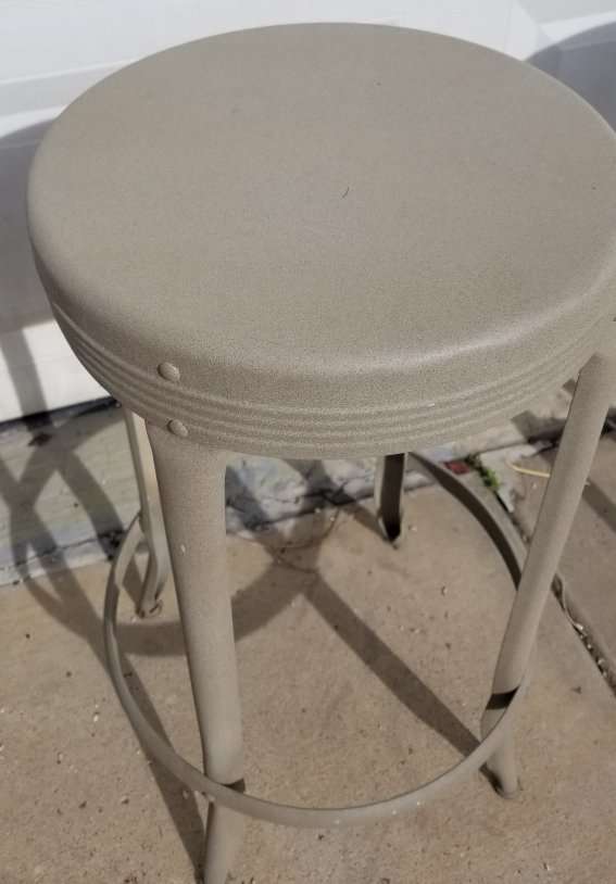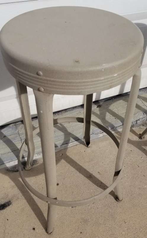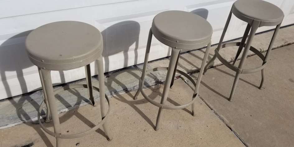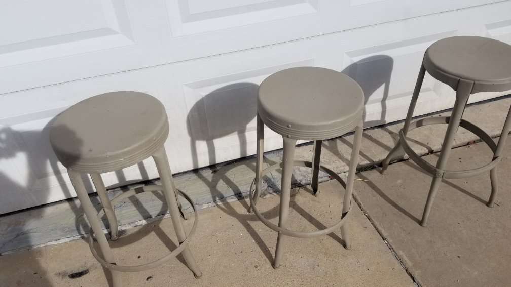 All 3 chairs have been primed and powder coated with a almond color paint. Very sturdy design. 40' 50s. Vintage stools. $30.00 each. Firm. OGDEN.