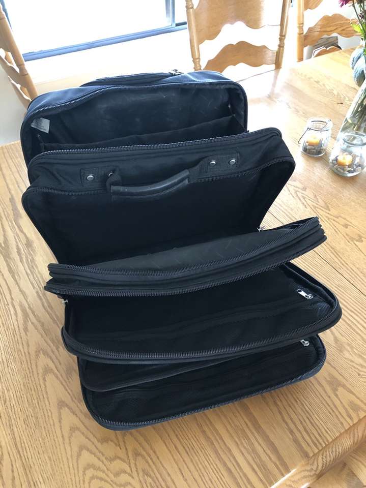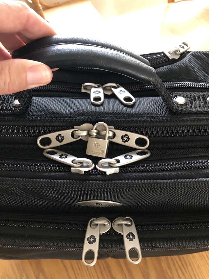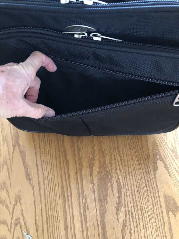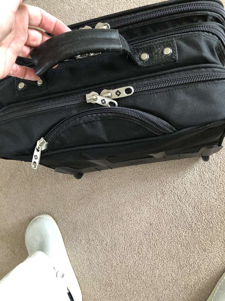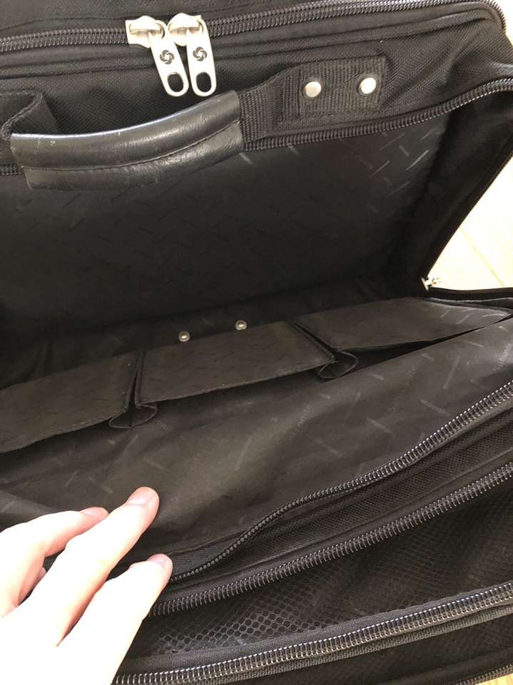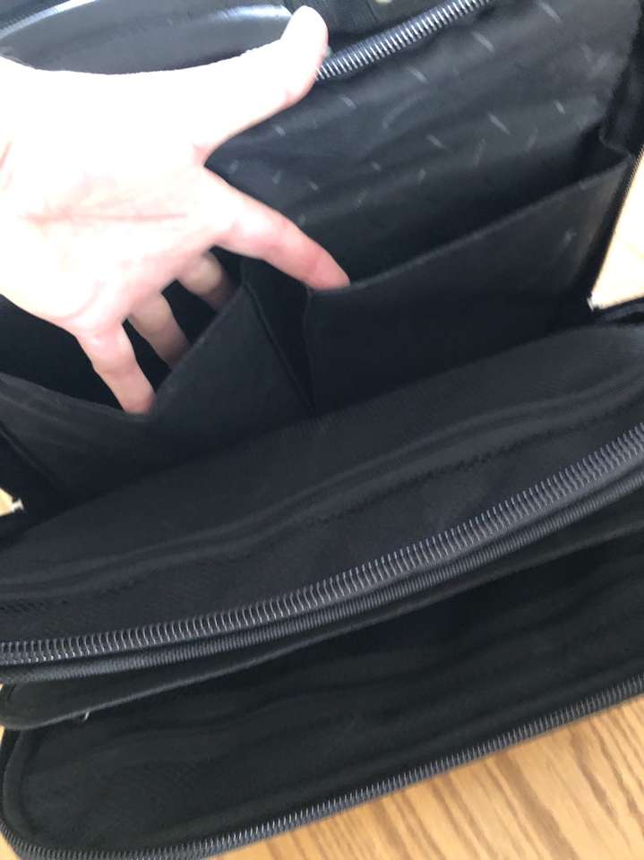 What you’re looking at is a bulletproof bag by Samsonite. As you will see upon reviewing the images there are many zippered compartments, a small lock with 2 keys [for the central locking zipper] and a telescoping handle for use with the built in wheels.