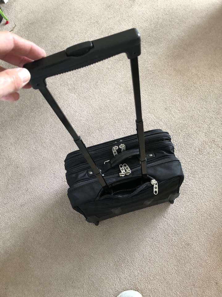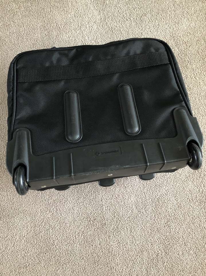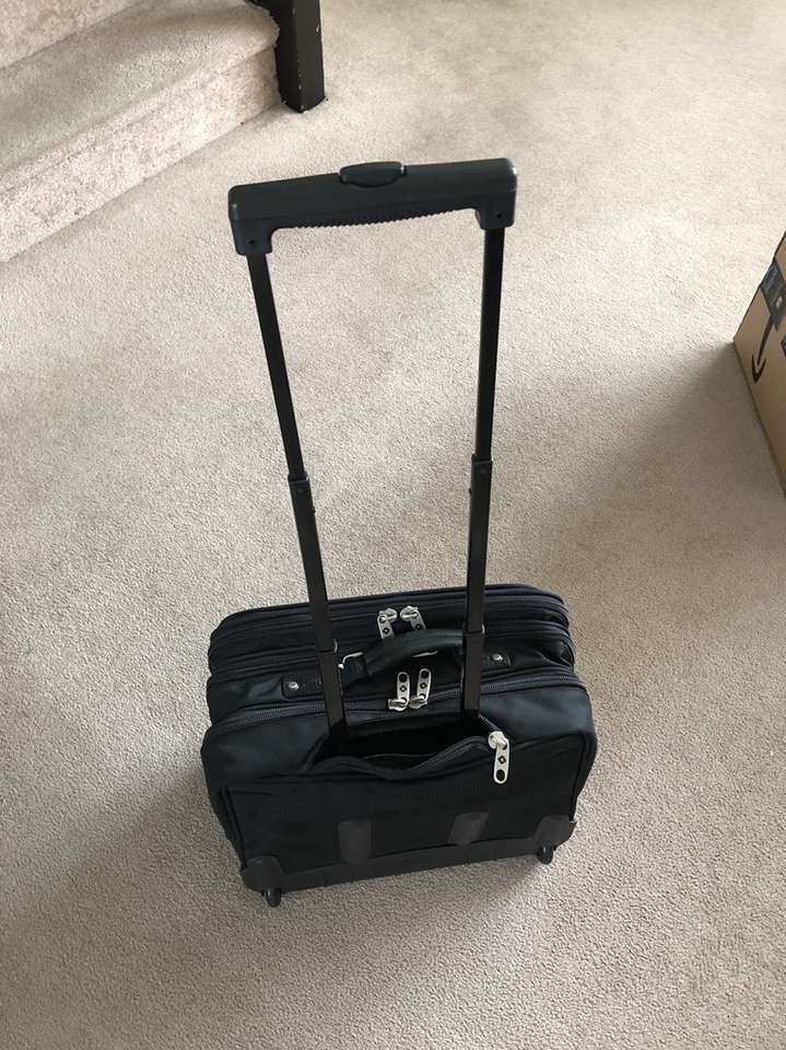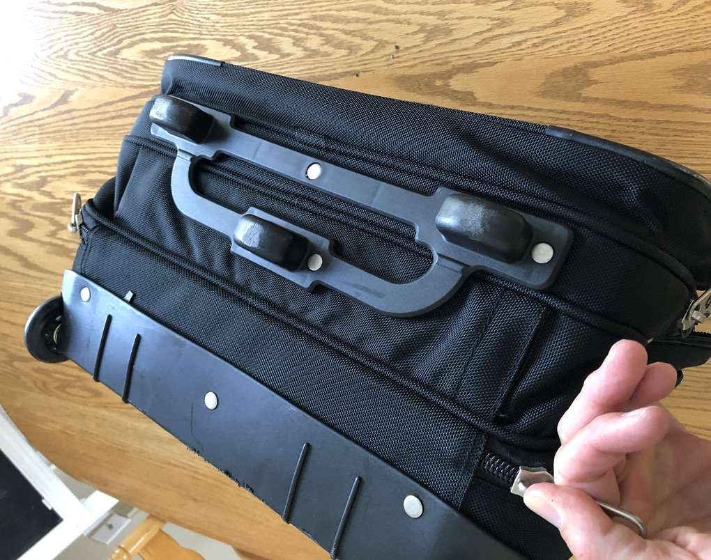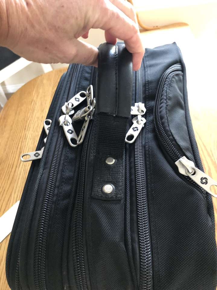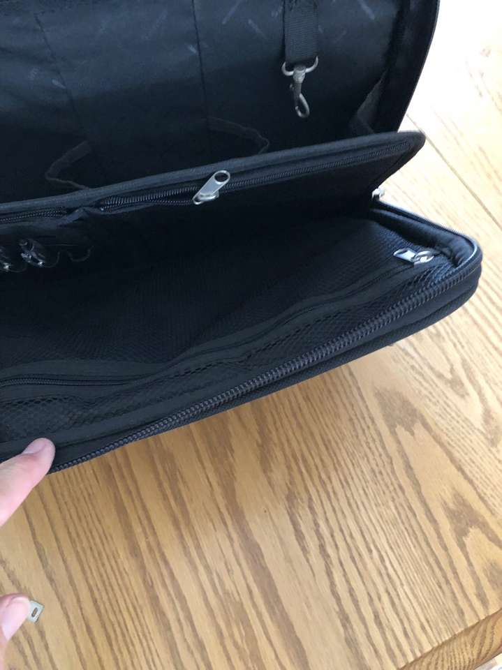What you’re looking at is a bulletproof bag by Samsonite. As you will see upon reviewing the images there are many zippered compartments, a small lock with 2 keys [for the central locking zipper] and a telescoping handle for use with the built in wheels.