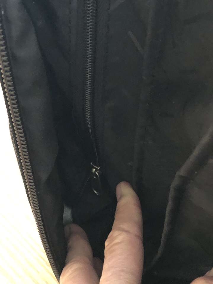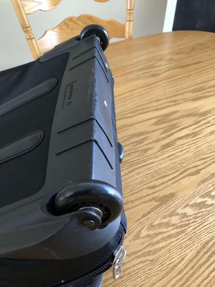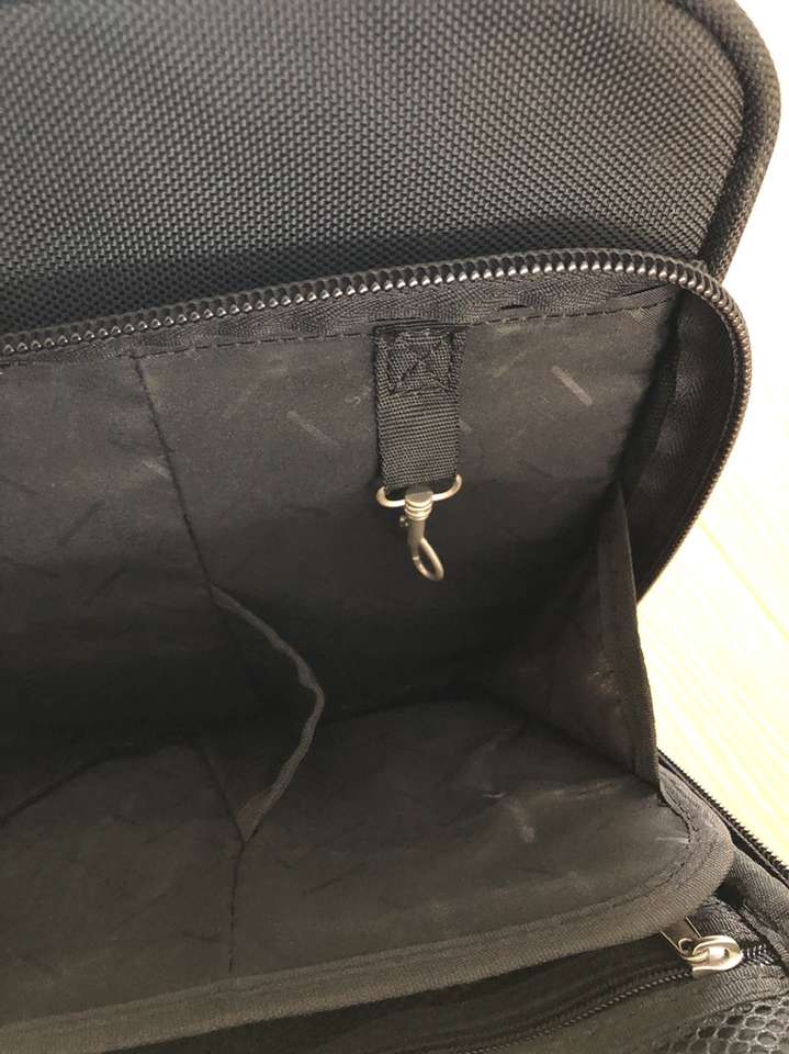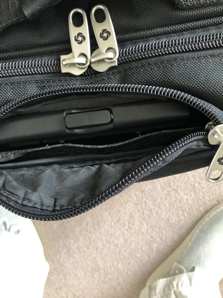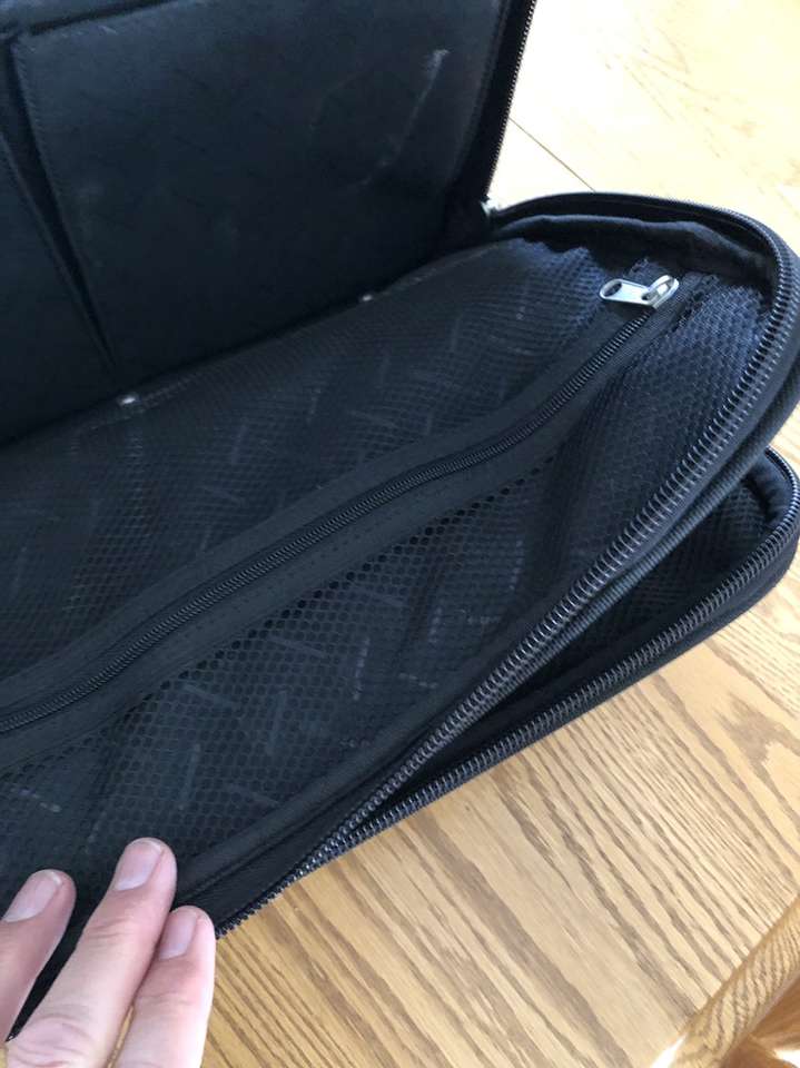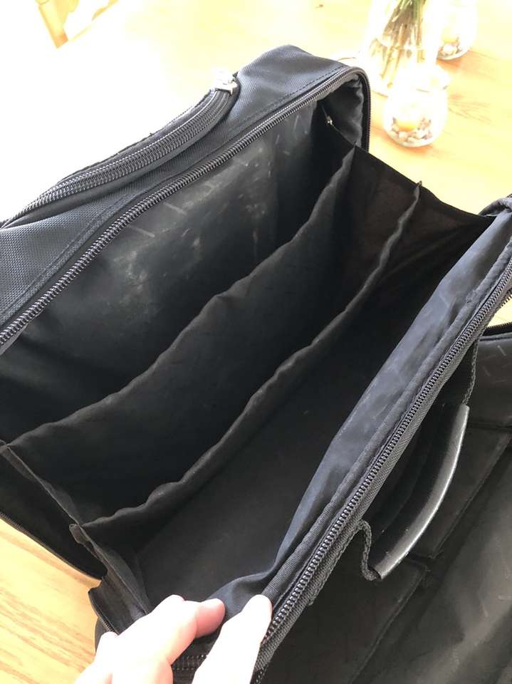 What you’re looking at is a bulletproof bag by Samsonite. As you will see upon reviewing the images there are many zippered compartments, a small lock with 2 keys [for the central locking zipper] and a telescoping handle for use with the built in wheels.