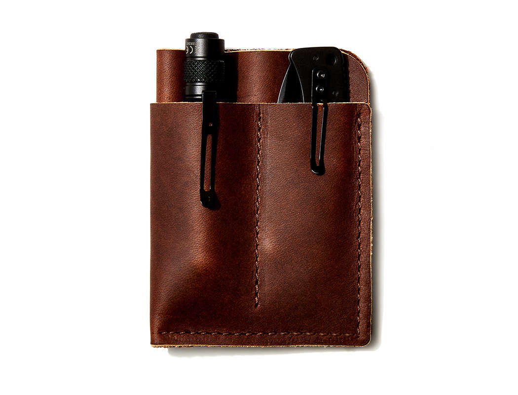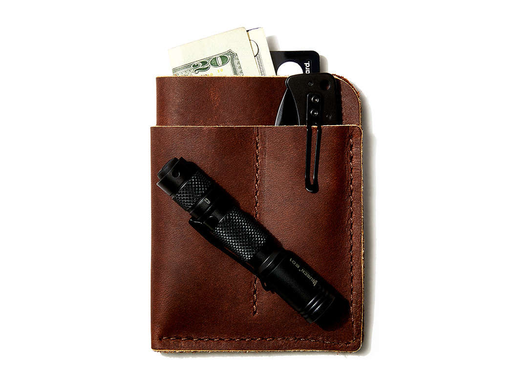 More than just a wallet. It’s got plenty of space for your usual cash and cards, plus it’s made to hold a small knife and a flashlight so you’re prepared for just about anything. Made from full-grain leather sourced from S.B. Foot Tannery in Minnesota this functional piece is a utilitarian upgrade on a standard cardholder. It’s got a roomy middle pocket for folded cash and a back pocket for cards, with two pouch pockets on the front meant for a pocket knife and a small flashlight — or any other small accessories you want to keep with you.
