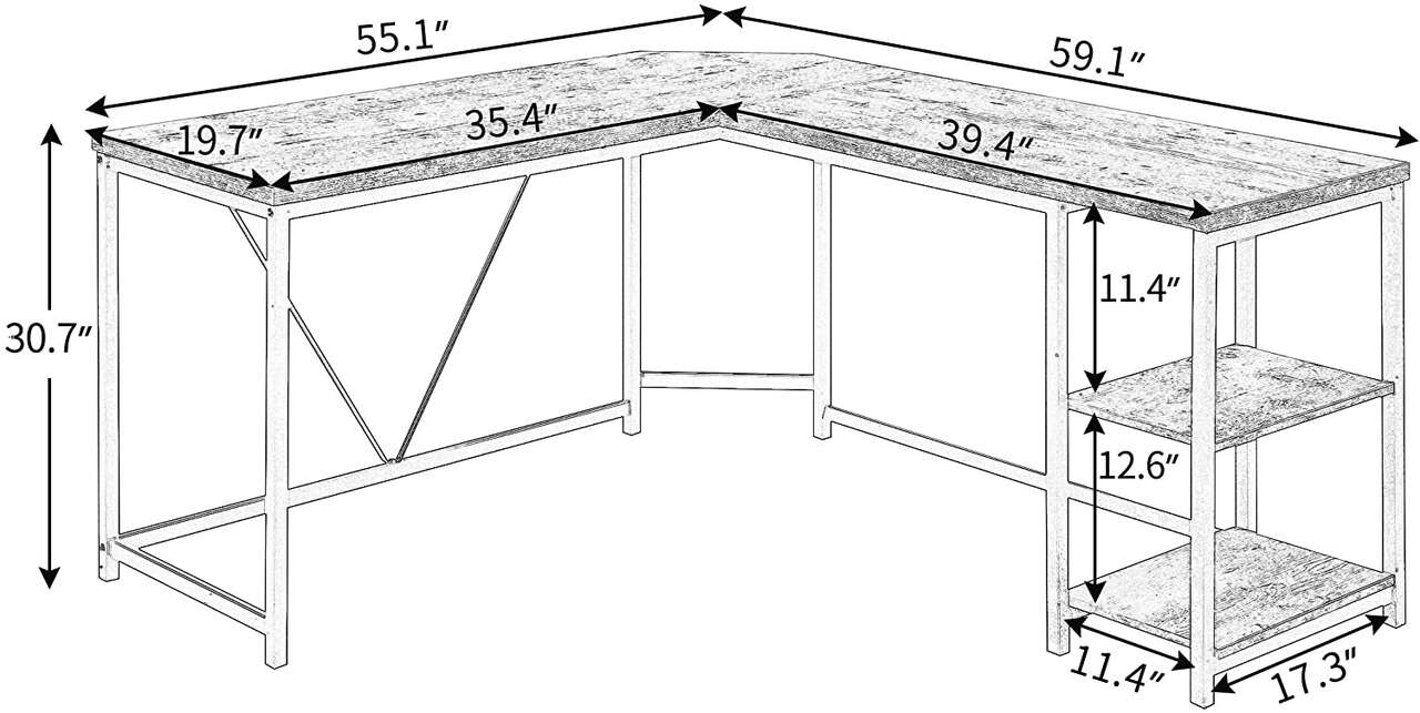Desk Dimensions: 59.1"x19.7" & 55.1"x19.7"; Height: 30.7" Both storage shelves measure: 17.3"x11.4" Desk weight: 68 pounds
