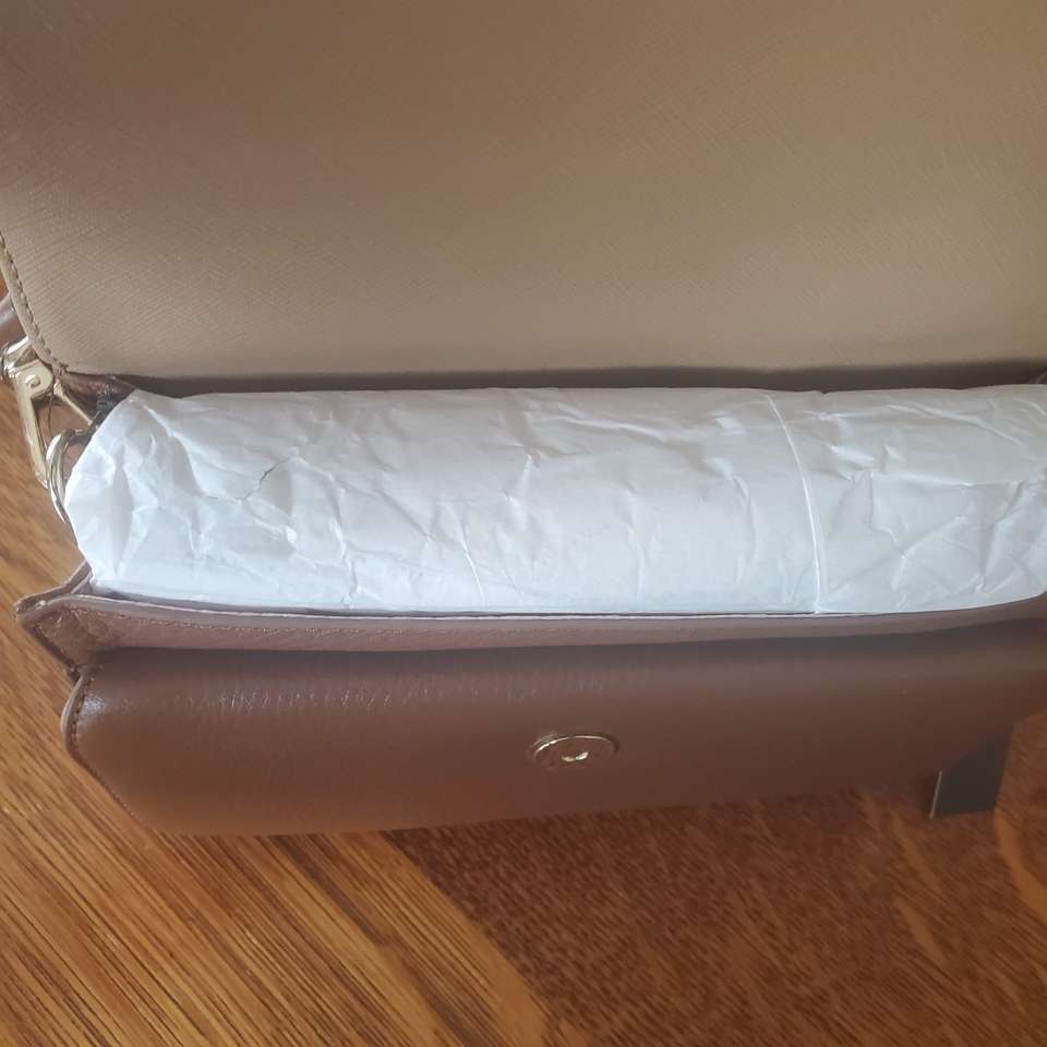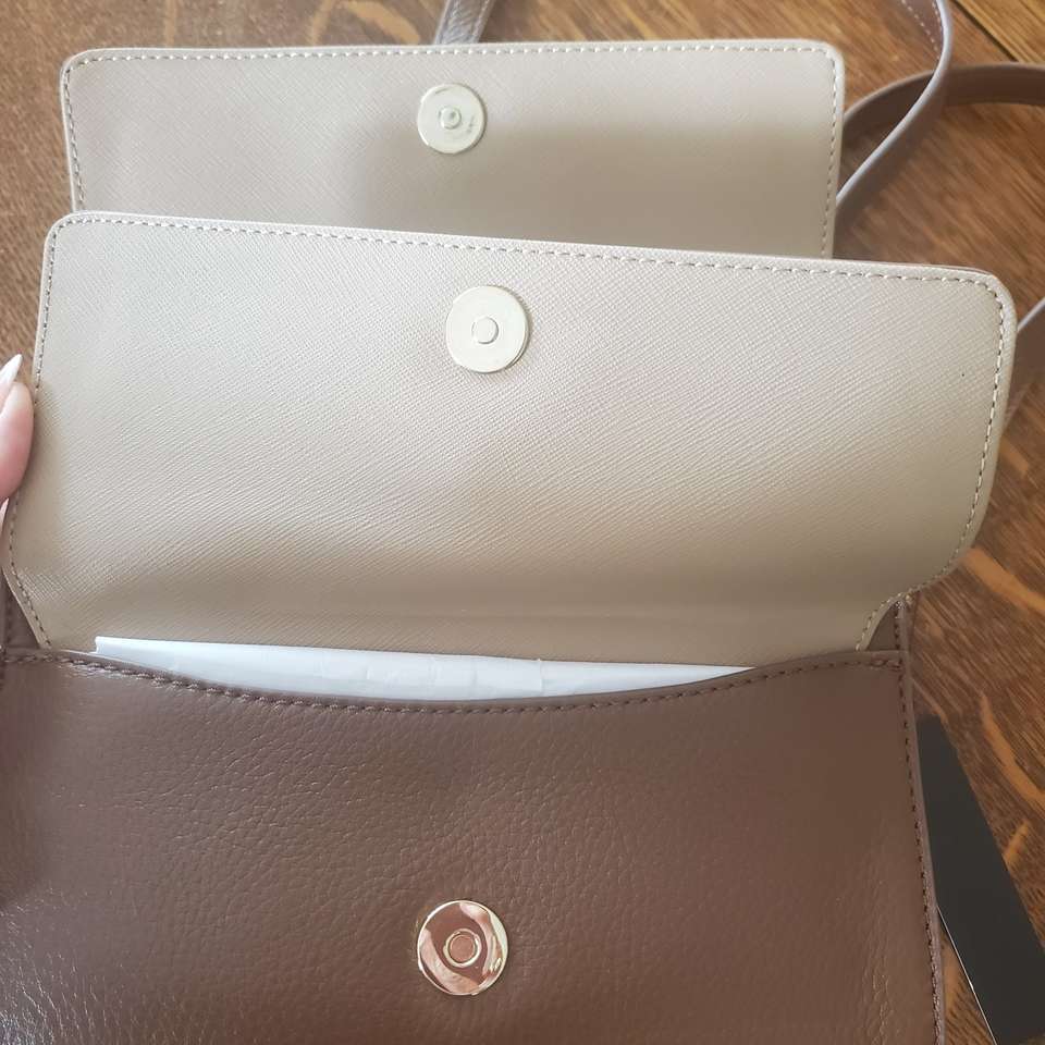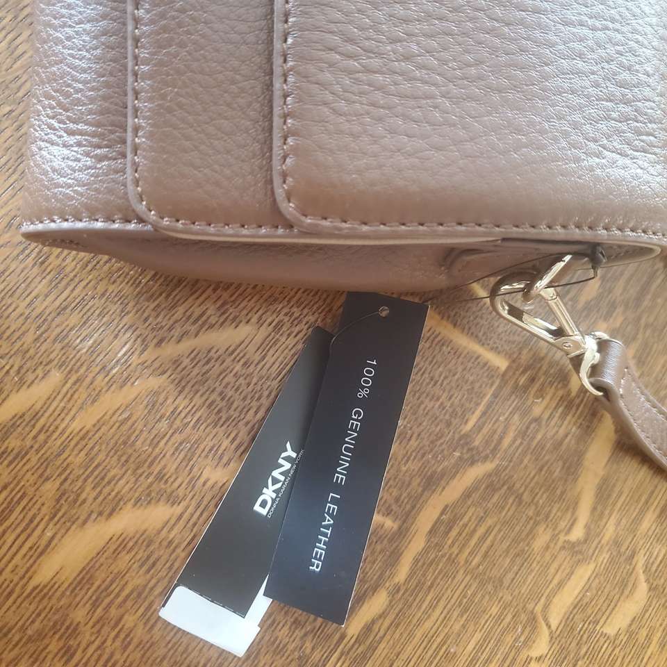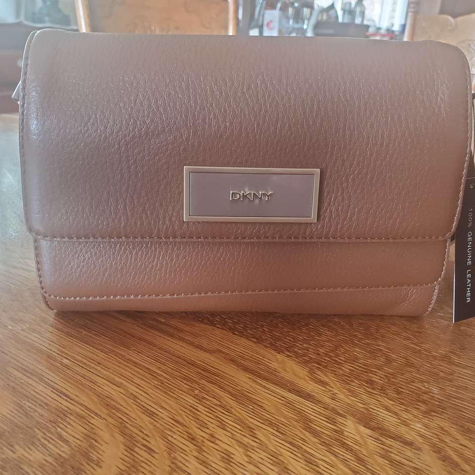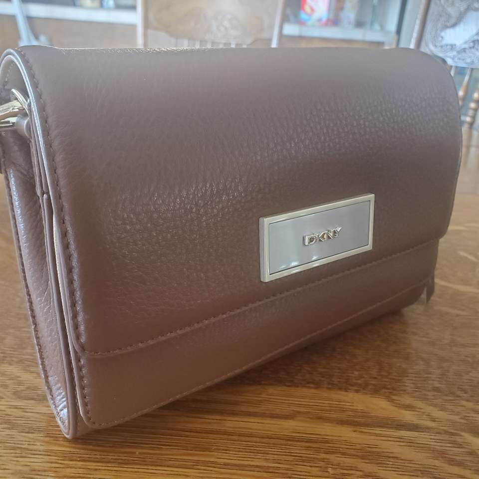 DKNY amazing Signature Leather Uni-sex Crossbody bag in soft luggage-brown. Double magnetic flaps, inside zipper closure, removable shoulder strap, inside side pouch. Bought this from Amazon. Never used, bran new. Soft 100% leather. Comes from smoke free, pet free home.