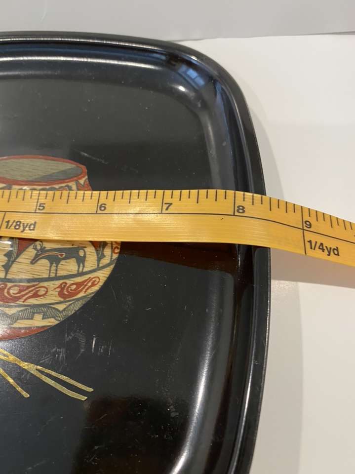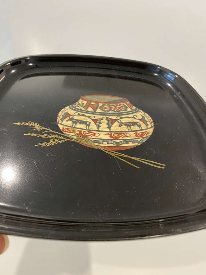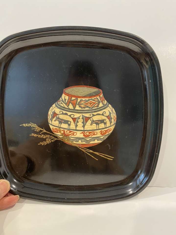 Vintage courage tray(8.5x8.5) with Indian basket. There are some scratches and a little bubble on the basket. Price reflects condition