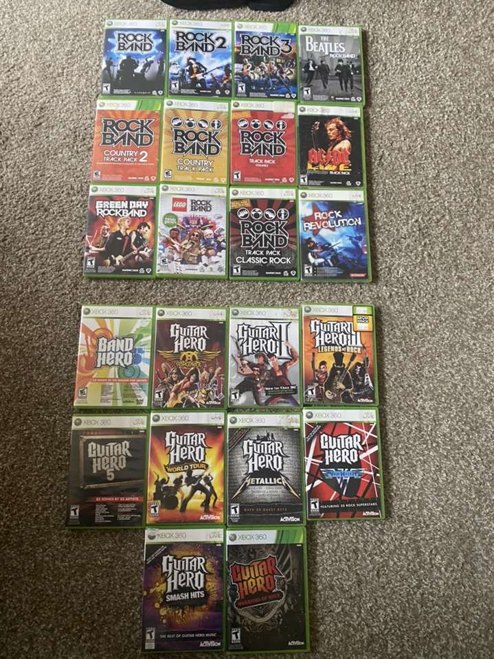 Rockband $25 Rockband 2 $35 Rockband 3 $60 RB LEGO $45 RB Beatles $25 RB Country $35 RB Classic Rock $45 RB AC/DC $25 Rock Band Track Pack 1 $25 Rock Band Track Pack 2 $25