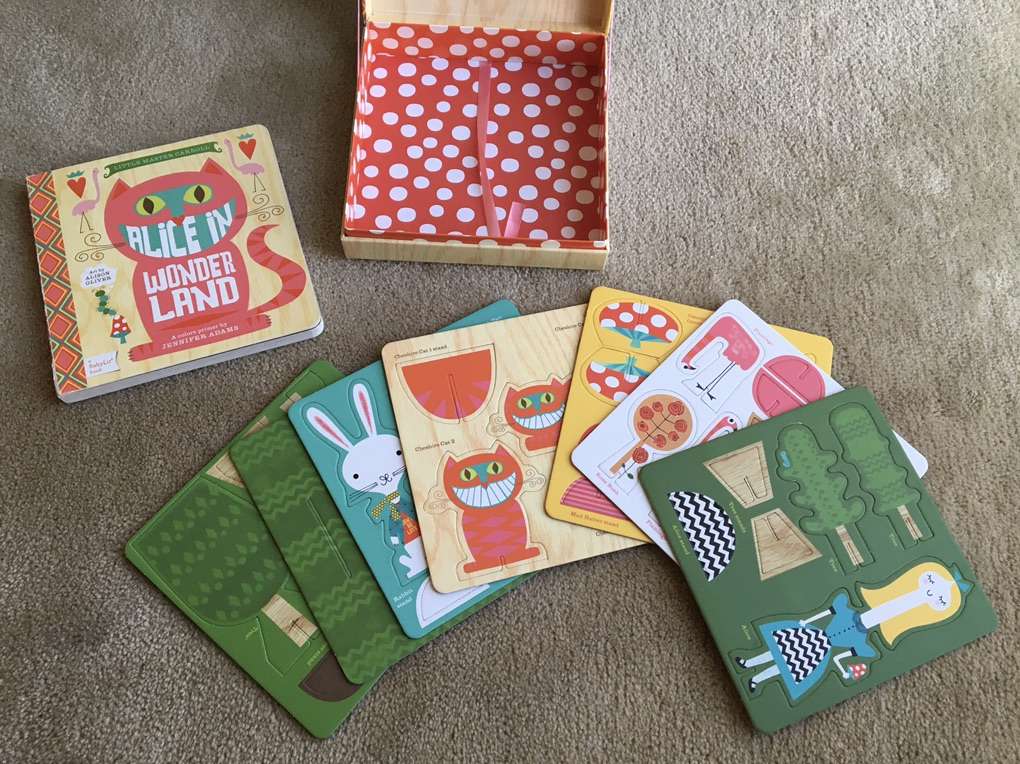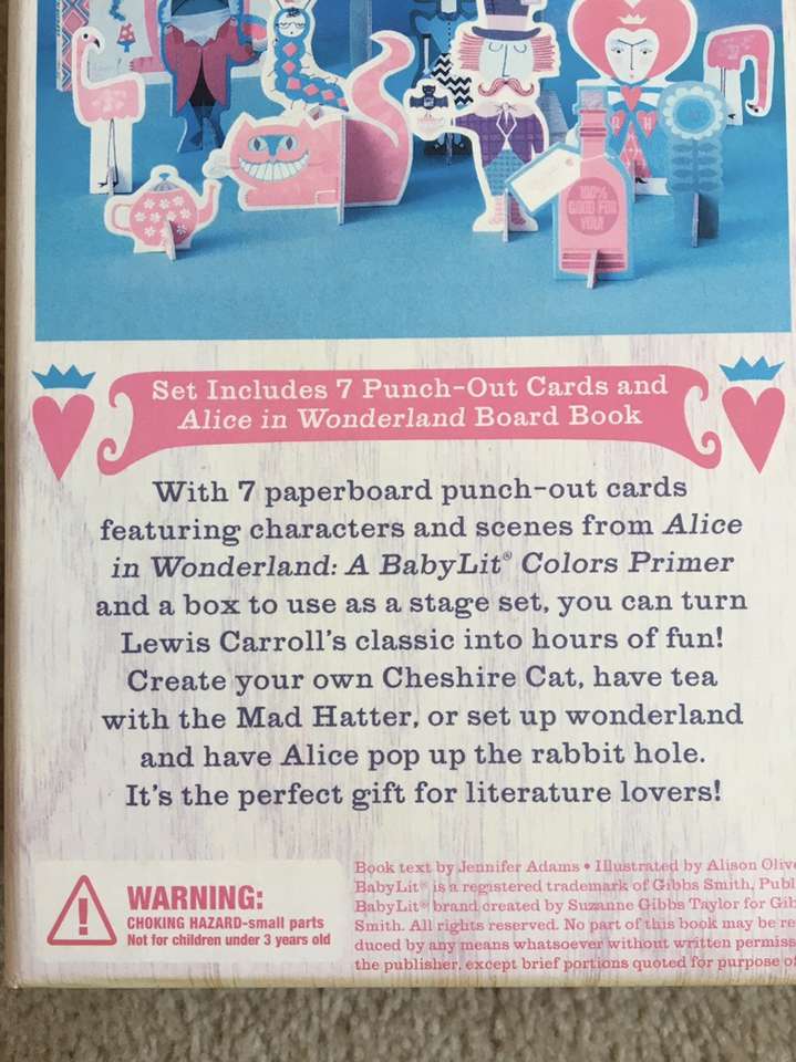 NEW (sealed in plastic) BabyLit Alice in Wonderland: Colors Primer Book and Playset by Jennifer Adams and Alison Oliver. Cute storage box, board book, and 7 paperboard punch-out cards of characters and accessories from the book to play with. New condition—never used (inner photos are from another set). Text only. Cash or Venmo. Discount on multiple items.