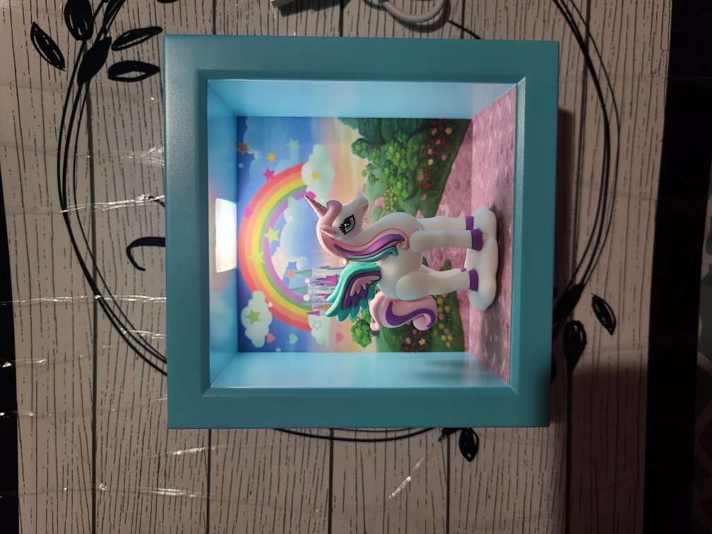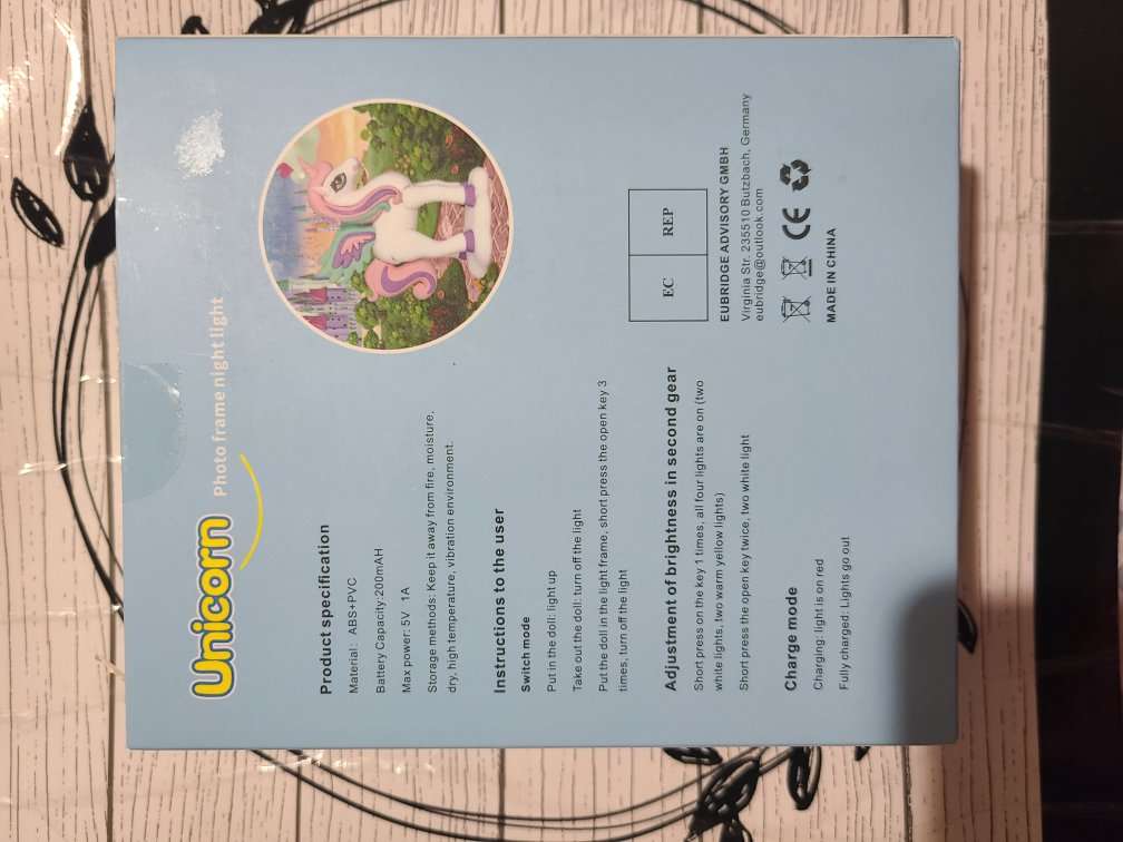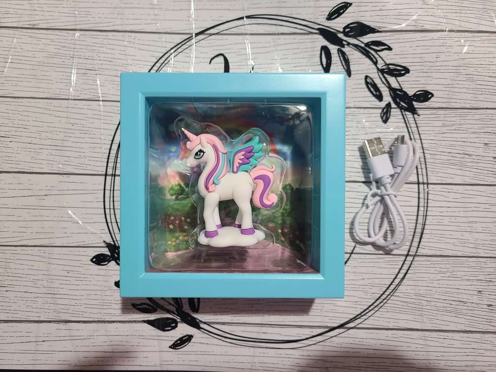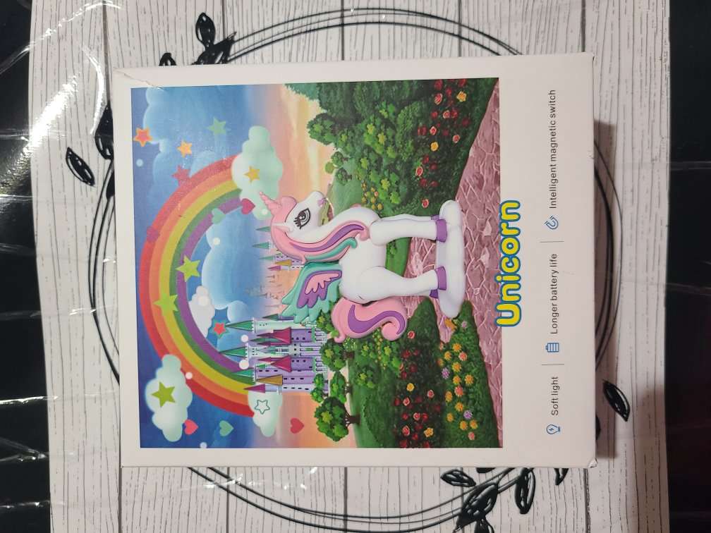 This unicorn light very is new in box. The unicorn is magnificent. When you position it where you want on the box it lights up. When you take the unicorn off the light turns off. There is an on/off button on the side by the charging port. (Charging wire is included). All my items come from a smoke free home. Any questions please feel free to contact me.