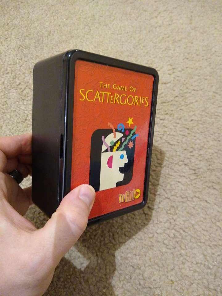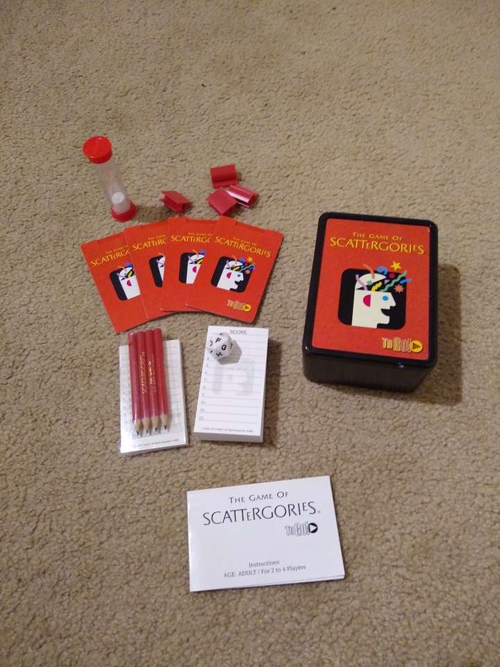 Scattegories To Go, open but never played. Cards are still in their plastic wrap. Like new.