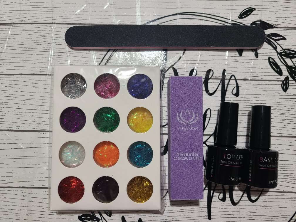 This listing includes 1 set of 12 glitter flakes containers, 1 container of 12 rhinestones, 1 set of top coat and base coat 8ml, 1 file and 1 buffer. These are all new never used. All my items come from a smoke free home. Any questions please feel free to contact me.