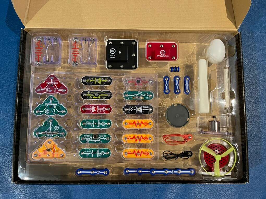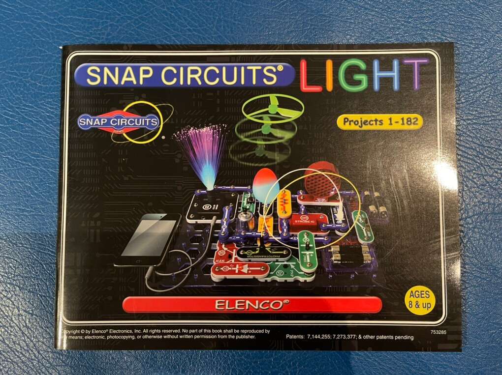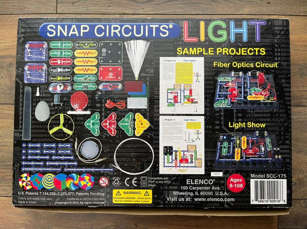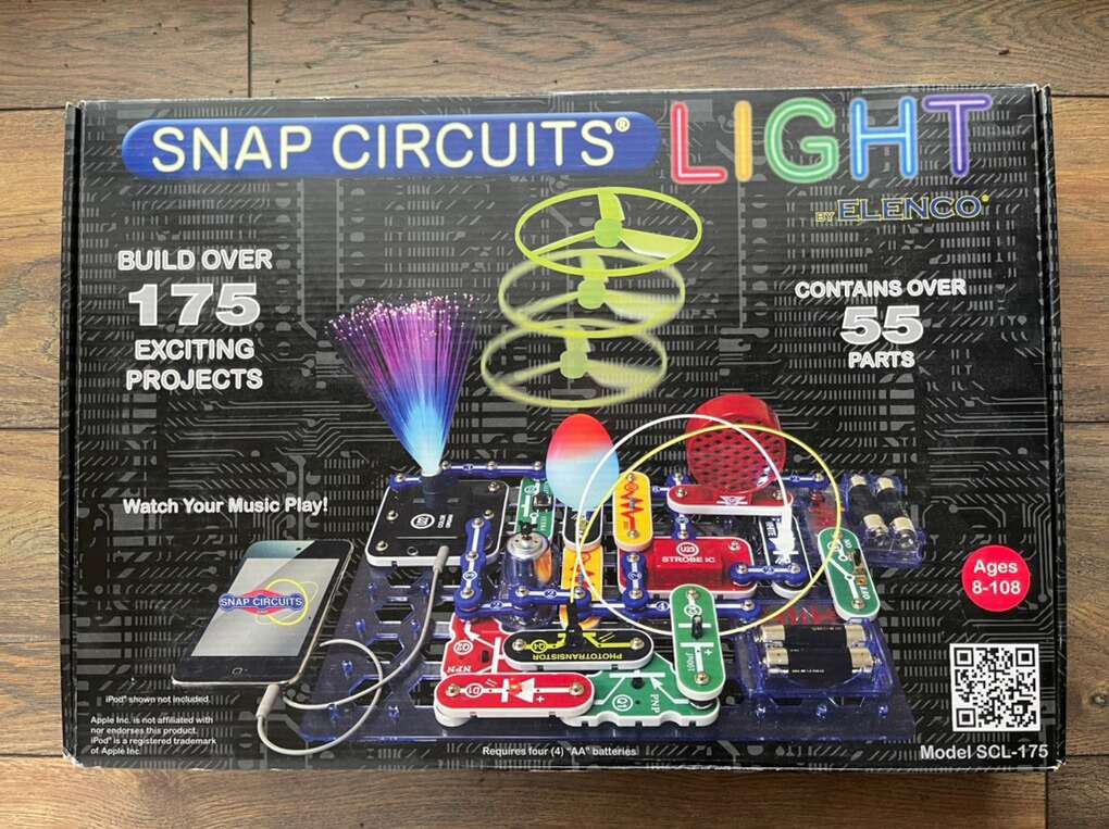 Watch and be amazed at what your music can do with the new Snap Circuits® LIGHT. Connect your iPhone® or other device and enjoy your music as the lights change to the beat. The strobe light with spinning patterns will amaze you with its visual effects.Elenco's Snap Circuits® makes learning electronics easy and fun! Just follow the colorful pictures in our manual and build over 175 exciting projects. All parts are mounted on plastic modules and snap together with ease. Enjoy hours of educational fun while learning about electronics. Features: Contains over 55 Snap-Together parts. Build over 175 exciting projects. Color organ controlled by iPhone® or other device, voice or finger. Enjoy your music as the lights change to the beat. Snap-together parts require no tools and ensure correct connections. Requires 4 AA batteries (not included) Clear and concise illustrated manual included and available online. Elenco's Snap Circuits® makes learning electronics easy and fun! Just follow the colorful pictures in our manual and build exciting projects such as FM radios, digital voice, recorders, AM radios, burglar alarms, doorbells, and much more! You can even play electronic games with your friends. All parts are mounted on plastic modules and snap together with ease. Enjoy hours of educational fun while learning about electronics. Snap Circuits® are endorsed by educators worldwide and used in schools, libraries, museums, STEM programs and creating with Snap Circuits®. The Circuit Safe™ patented safety device unique to Snap Circuits® branded products makes learning circuitry safe. No tools required. Uses AA batteries, unless otherwise indicated. Snap Circuits® products have won many awards, including Toy of the Year (TOTY), ASTRA'S Best Toys for Kids, Parent's Choice Recommended, Good Housekeeping's Best Toy, Family Choice, National Parenting Publications Awards (NAPPA Gold), Children's Choice, Dr. Toy (100 Best Children's Products, 10 best Educational Products, Green Toy Company), The inaugural Seriously STEM award & KAPi Award. https://shop.elenco.com/consumers/snap-circuits-light.html.