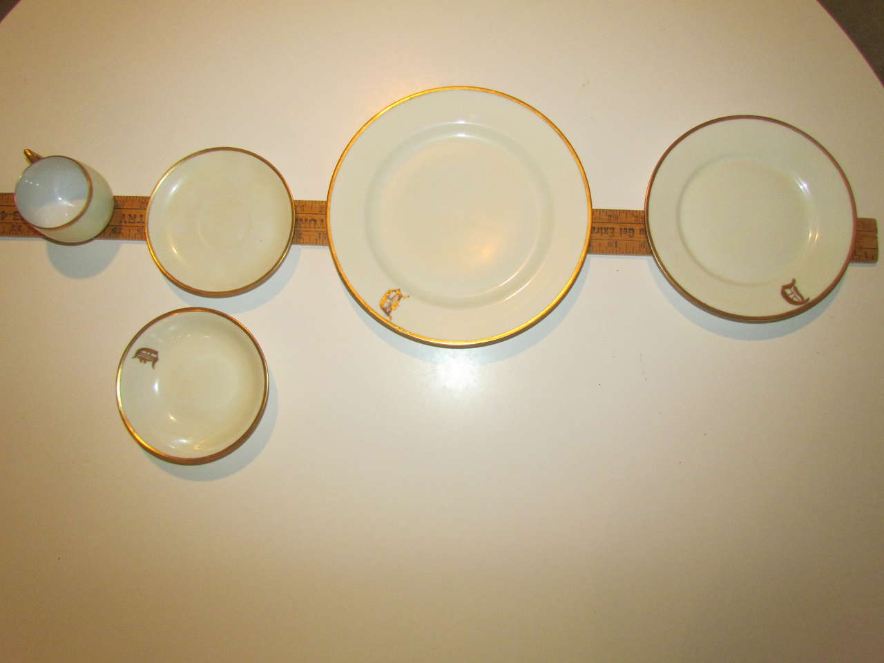 MIXED Antique Haviland France / Peeress Bavaria / Nippon & Noritake Japan 81 PEICES A VINTAGE WIMSICAL COLLECTION & TABLE PRESENTATION. These dinner ware item and serving collections were always mixed in presentationand placement at the table and received many complimentsthrough the generation of my families owner ship. If you have a last name that starts with a D your really in luck !! All descriptions are approximate as to count and country of origin for several item are simply one of a kind. the white cups marked with the Old English Script of the letter D hall mark hold approximately 2/3 of a cup ofliquids while the soup bowls hold just about 14 ounces of liquidsto below the rim. Count Hall Mark D items: White with gold rim and hall mark count 11 cups_makers mark_Germany. White with gold rim ( no hall mark ) 5 1/2 saucersfor cups count 12 _ makers mark_Germany. White with gold rim and hall mark 10 serving plates_count 11_makers mark_Haviland France. White with gold rim and hall mark 7 3/4 side plates_count 9_makers mark_Hulschenreulher -Selb Bavaria. White with gold rim and hall mark 5/1/2 soup bowls_count 12_makers mark_Hulschenreulher -Selb Bavaria. White with gold rim and hall mark 13 oval length seving plater_count 1_makers mark_Hulschenreulher -Selb Bavaria. The other items being a count of 26 serving items are mostly - makers mark_ Noritake / those being the items with golden hue with a woodland themes, others are makers mark_ hand painted Nippon. Pictures are of the actual item for sale, I have more pictures and can furnish additional information upon request.
