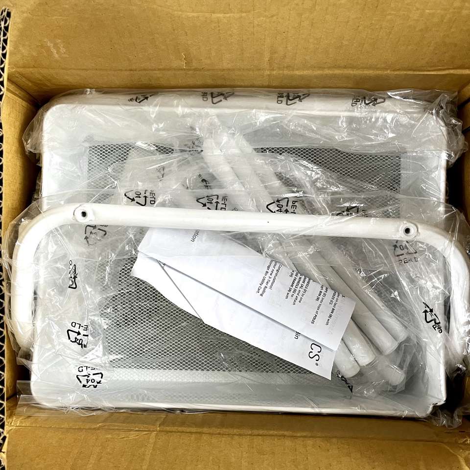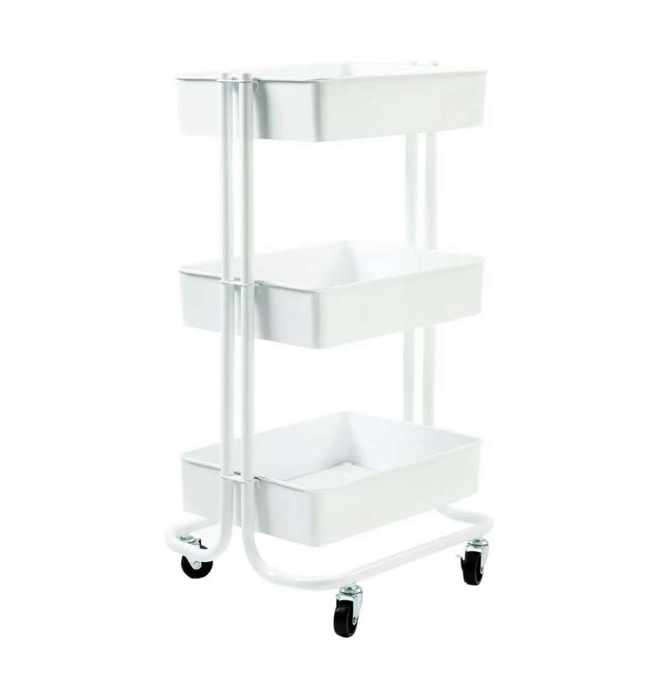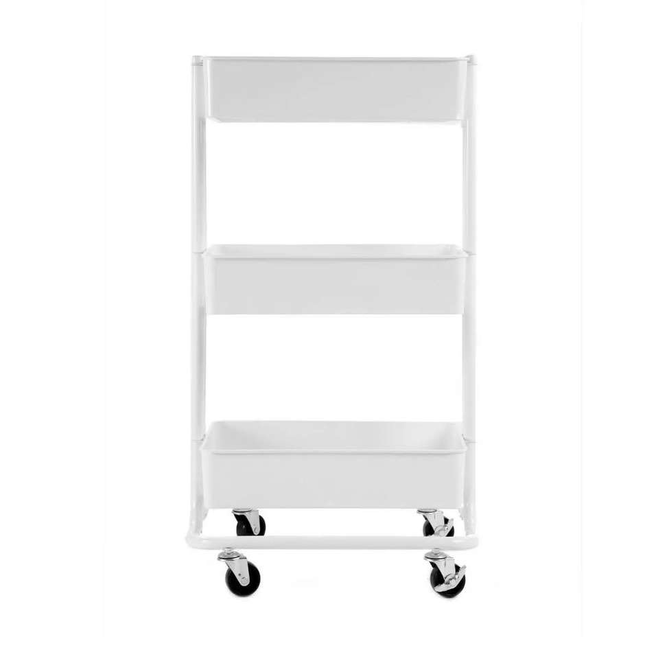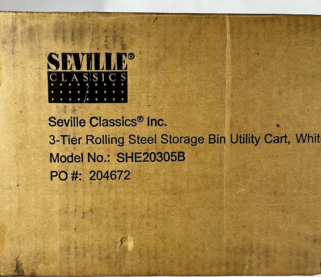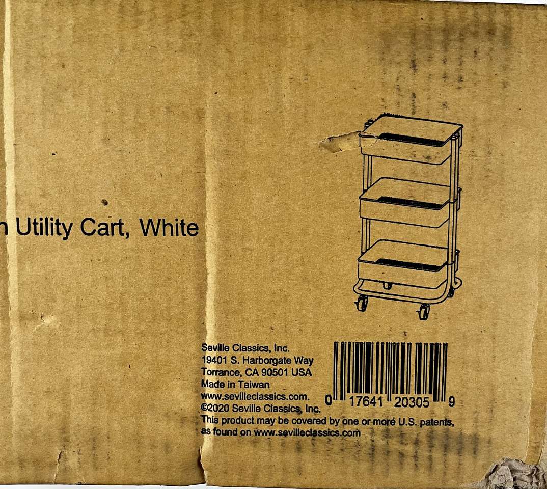 Seville Classics 3-Tier Rolling Steel Storage Bin Utility Kitchen Trolley Cart Color: White New- Open Box. One corner is bent, see pictures. Last two pictures are stock photos. Trollery cart is in a box and has not been put together.