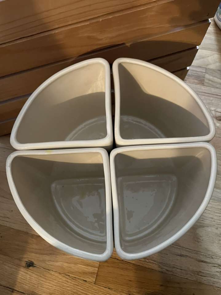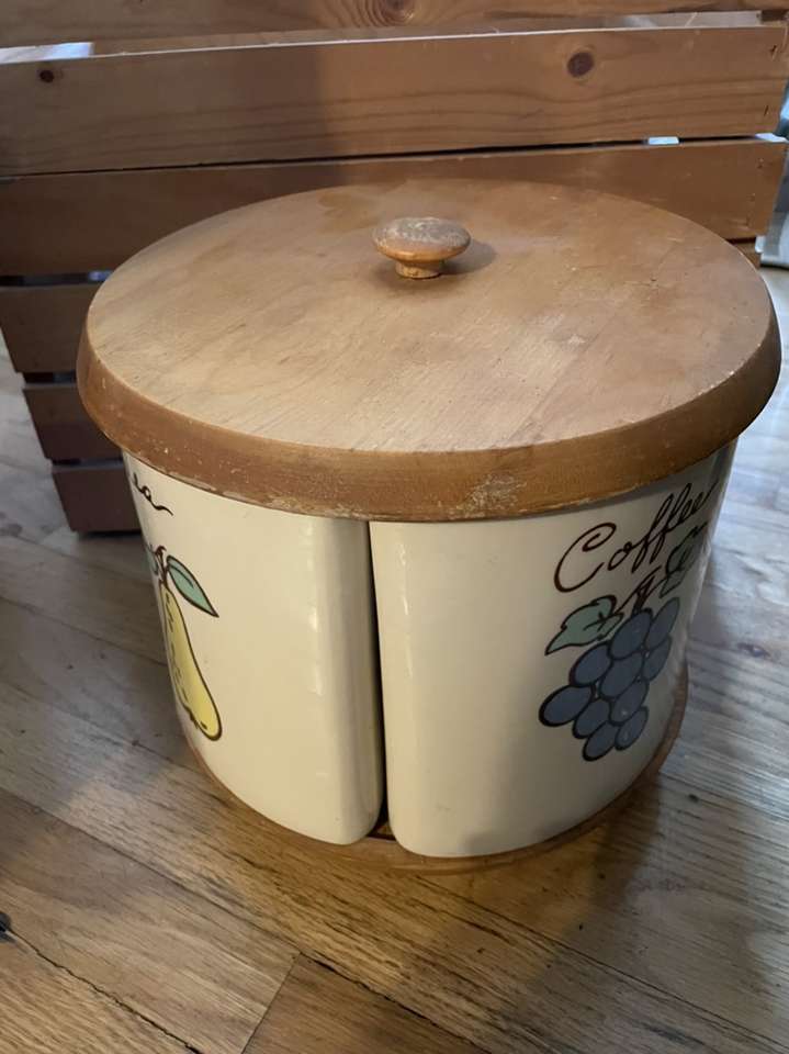 Ceramic and wood Lazy Susan. Used for storing sugar, flour, coffee, and tea. Cute painted label on the front of each ceramic compartment/ section.