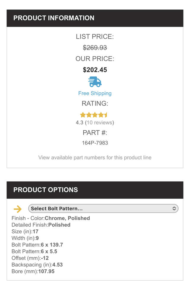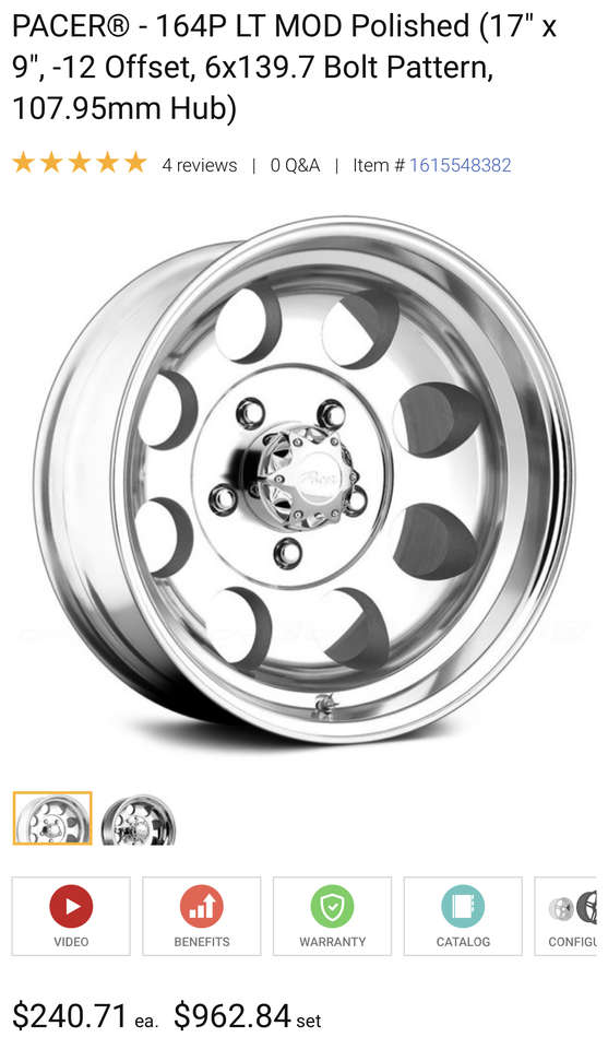 Pacer 164P-7983 17" Wheel with 12" offset. Wheel are new in box. Freight returns. Not sure what model or make these will work on.