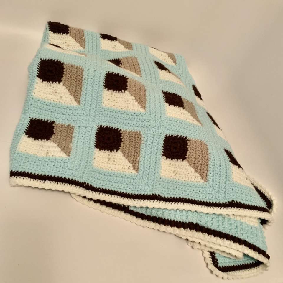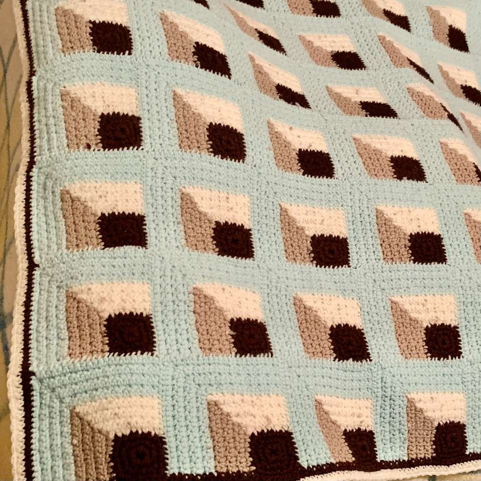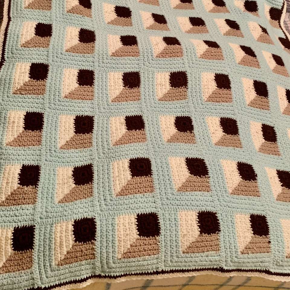 VenmoAqua, Ivory, brown & tan with geometric shapes and a dark brown and Ivory trim around all the edges. Beautifully and expertly hand crocheted of acrylic yarn - thick heavy with no holes Afghan / Blanket 4.3’ X 5.6’ (close to twin bed size) like new condition with no stains flaws or snags, No smoke, weird smell or pet hair. 75$ obo Please Message if you’re interested in purchasing it.
