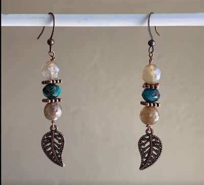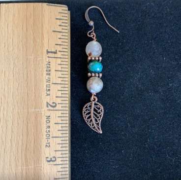 Black Fire Agate and Emerald (green) Earrings with copper leaf findings.