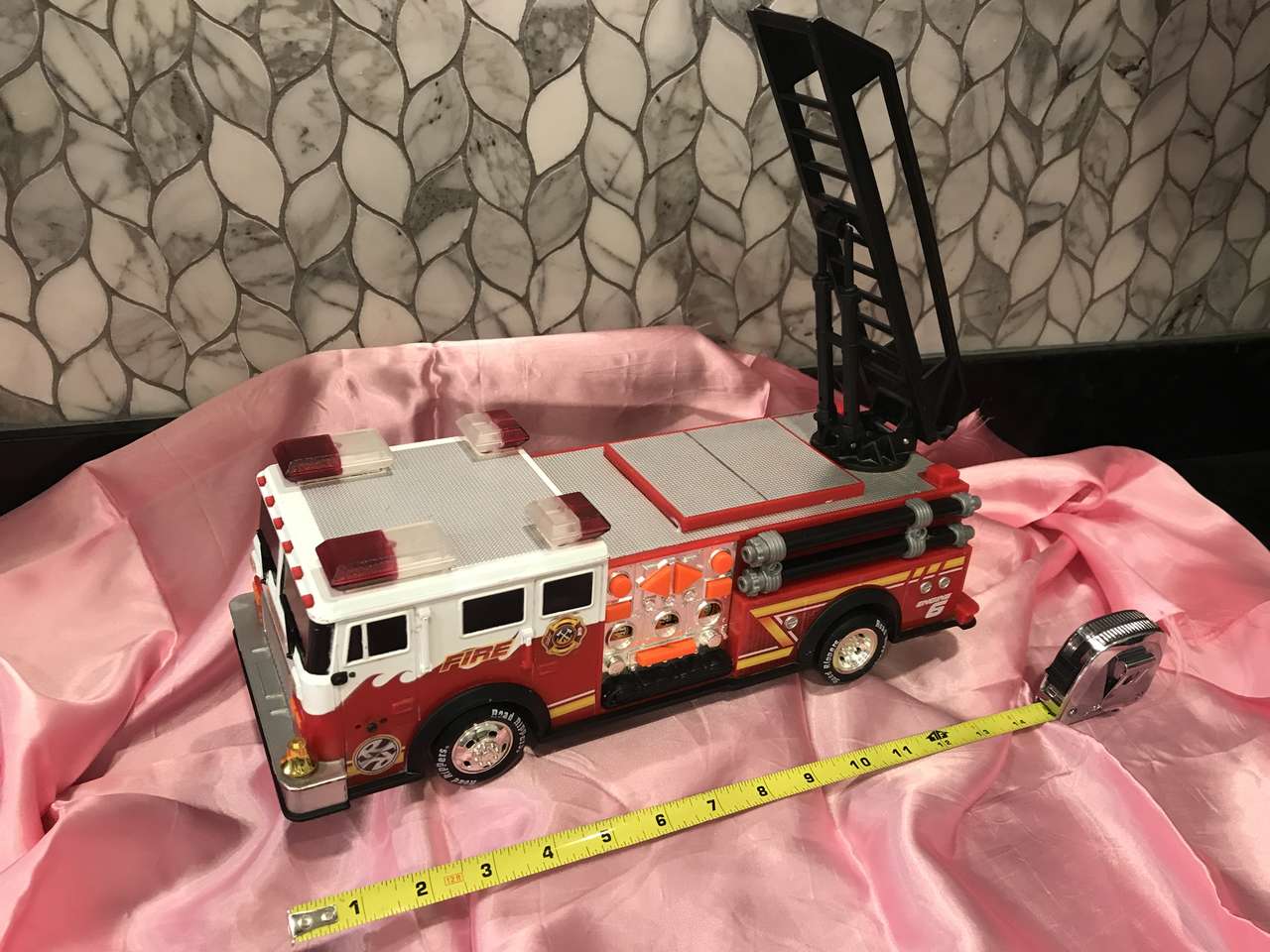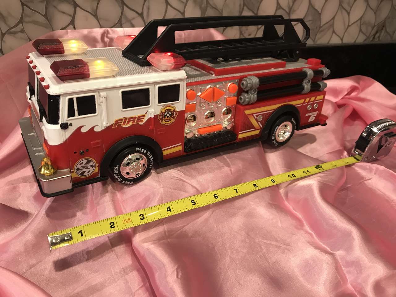 VenmoROAD RIPPER FIRE TRUCK by Toy State Industrial. 14 inches long, 5.5 inches wide * 5.5 inches tall. With batteries it moves forward or backward with the push of a button on the side gauges panel. Voices talk about ETAs. Hook and Ladder assembly on top goes up & down. Other buttons on side cause lights to flash, sirens to sound and one plays music. This truck does it all. In Perfect Condition. $45 online used sites. Only $19 Cash/Venmo. In Sandy. 801-201-5350. See all 4 photos for more details.
