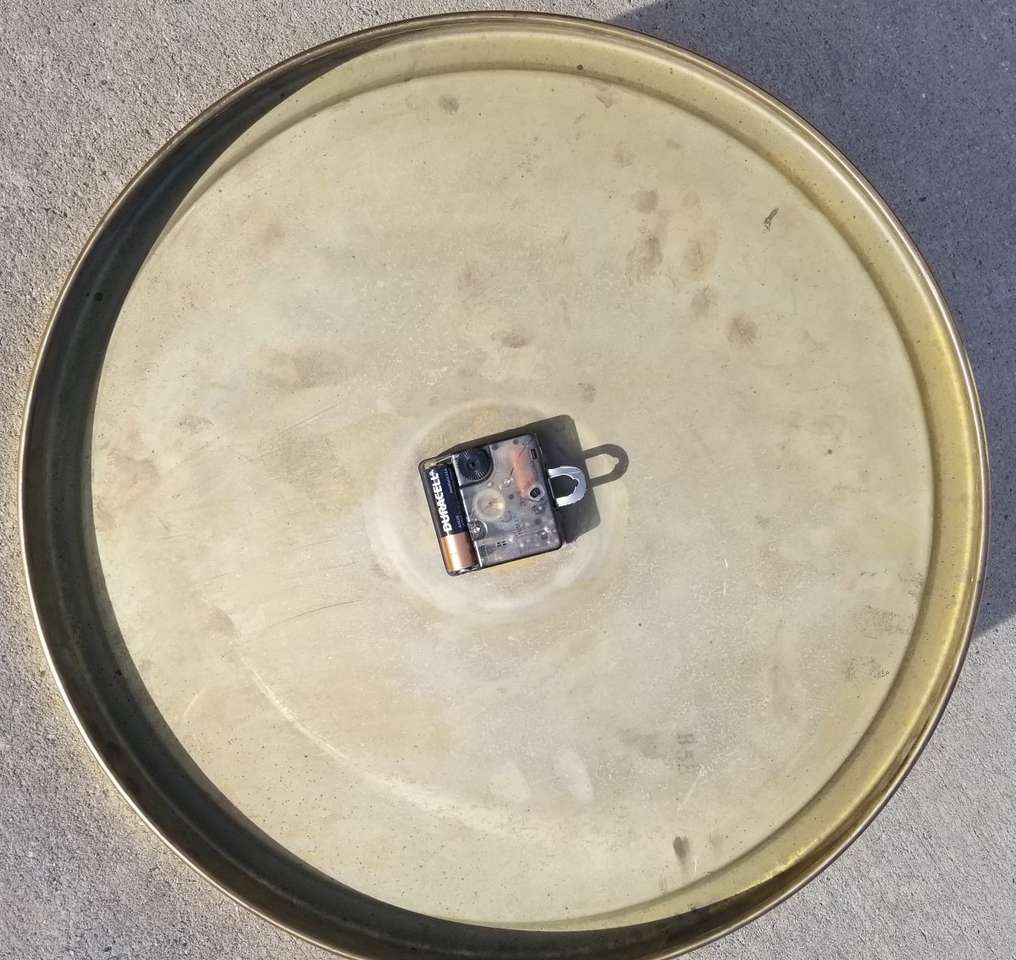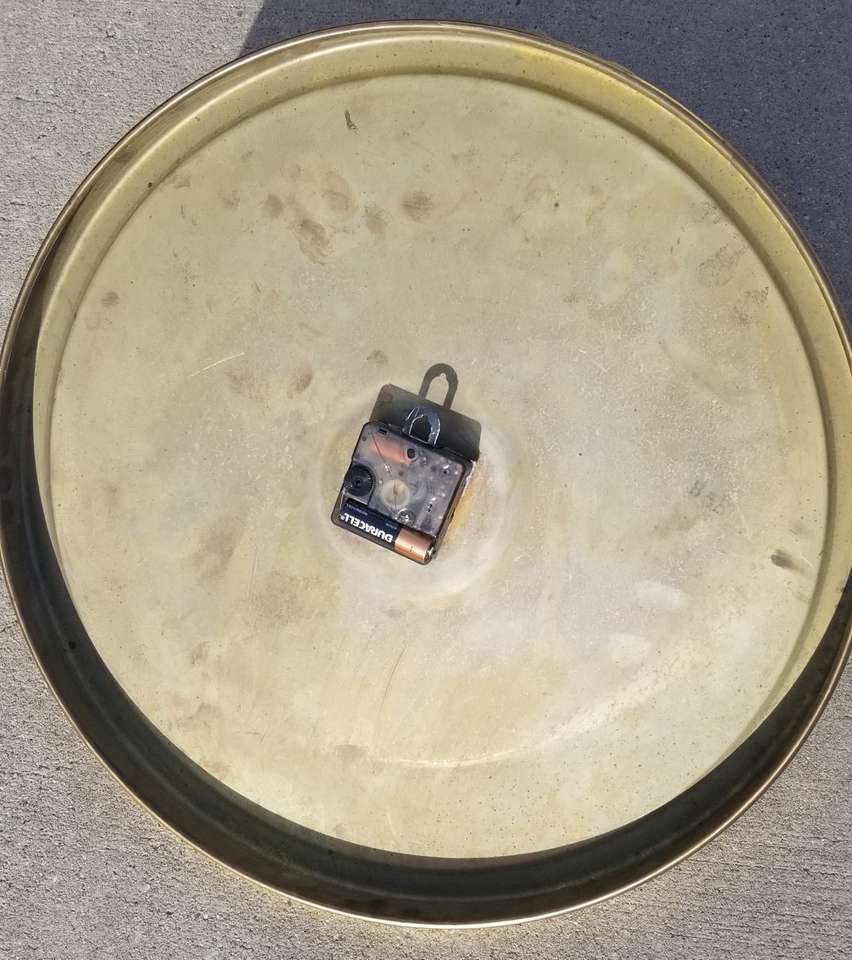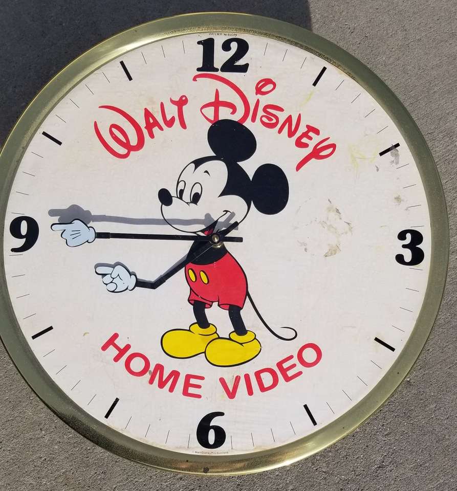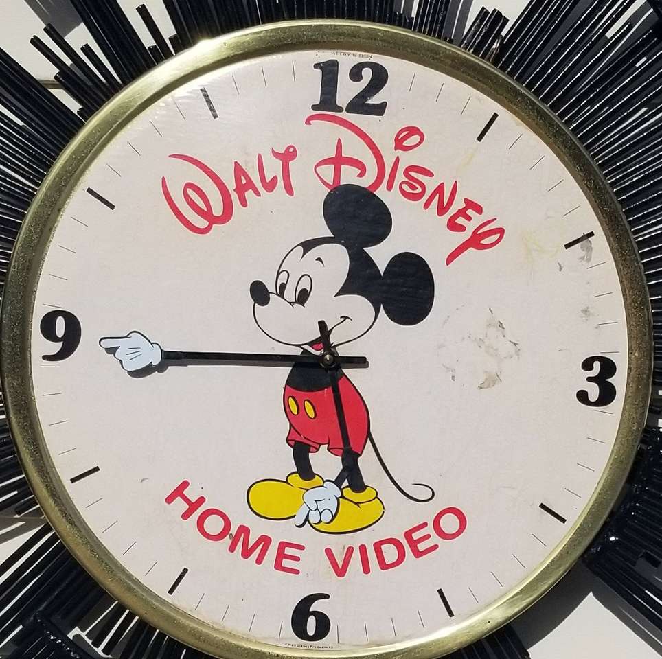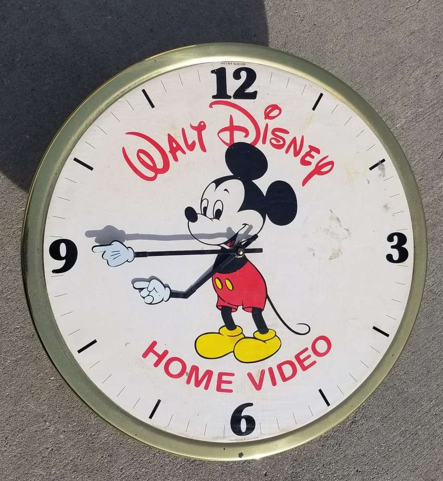 "RARE" 1980 WALT DISNEY HOME VIDEO brass 17" wall clock. Elgin brand. (Weiby Elgin) 1-1/8" thick. Real brass frame and back, one piece. Paper/fabric type face. Metal hands. 1-AA battery clock works. Not sure if that works and keeps time. B58 on back of clock. NOTE: black metal star burst NOT included. $55.00 porch pick-up in Ogden.