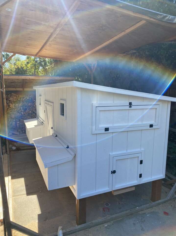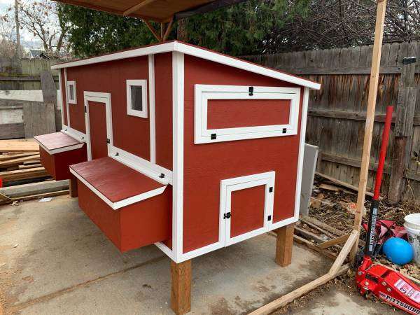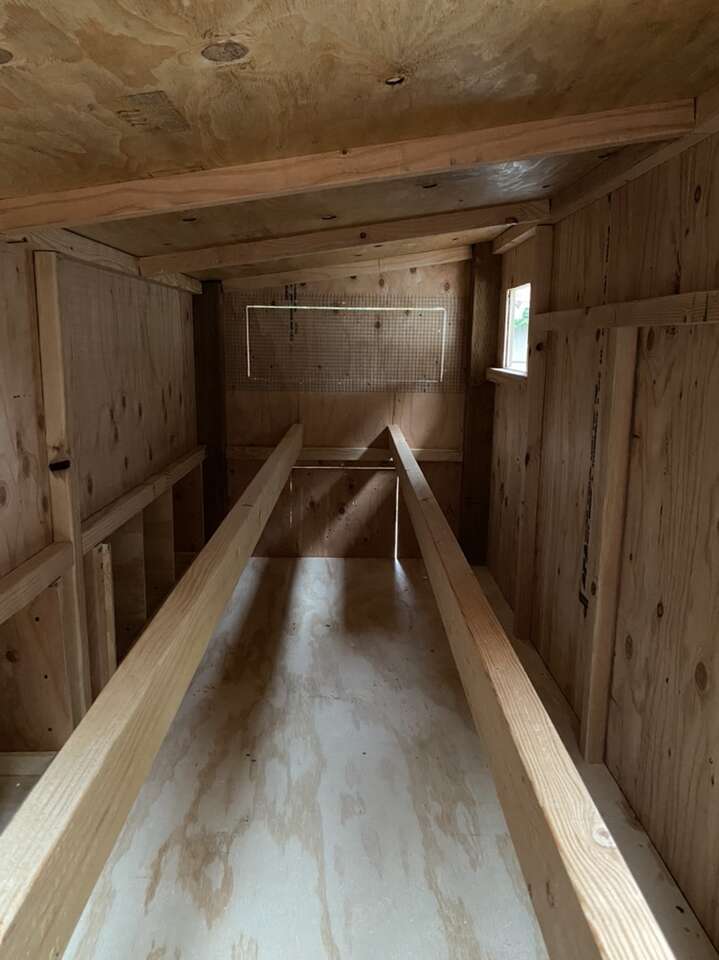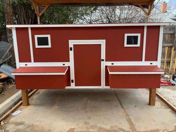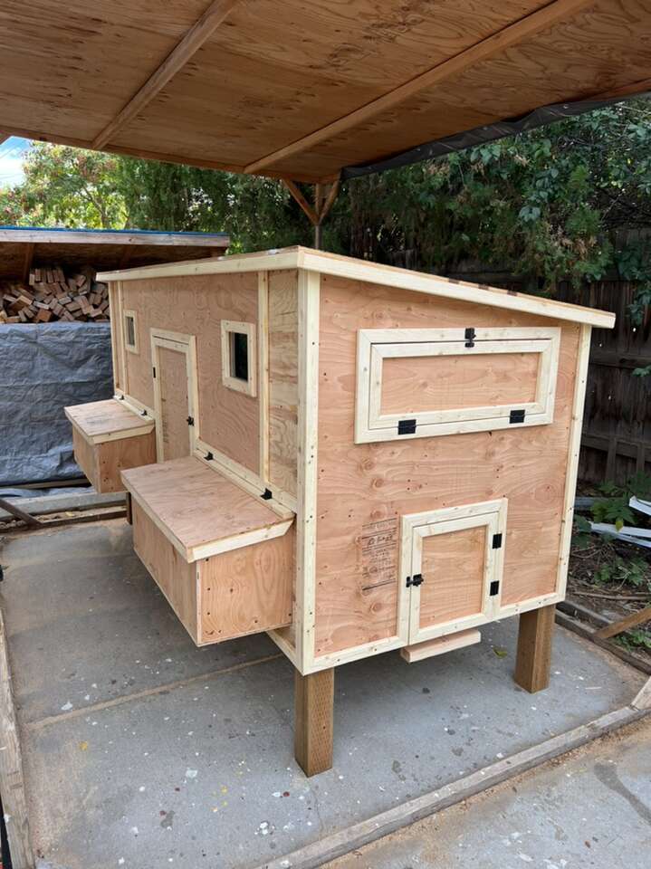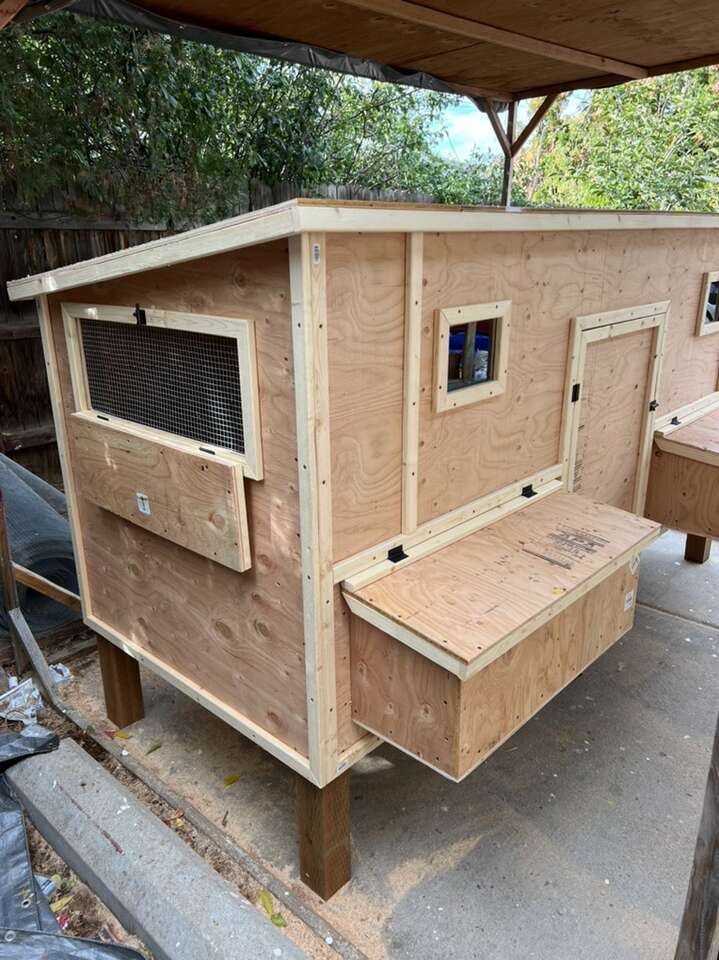 It includes: • 2 nesting boxes with 4 nesting/egg laying spots • 2 big ventilation Windows on each side • 2 doors to access the eggs • Two roosting sticks • 1 (16in x 16in) chicken access door • 1 (3.5ft x 2ft) large human access door/cleaning door • Made from new plywood(it lasts a lot longer than OSB) •Hardware cloth behind the ventilation windows to keep the animals out