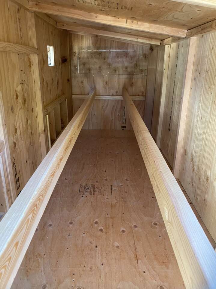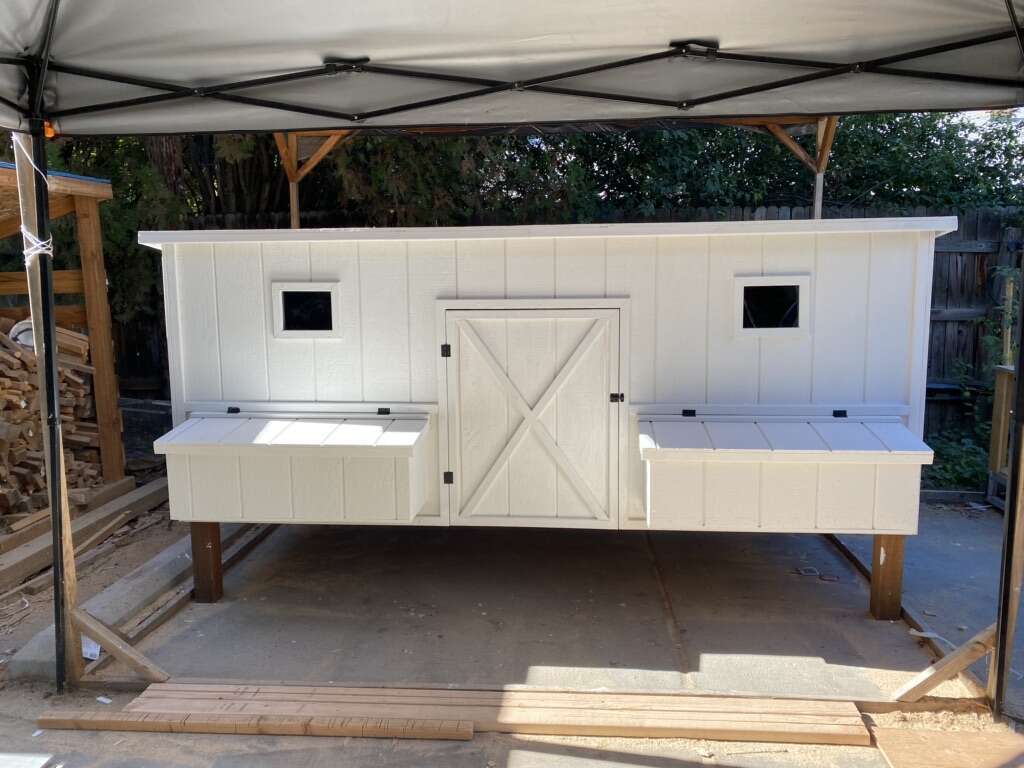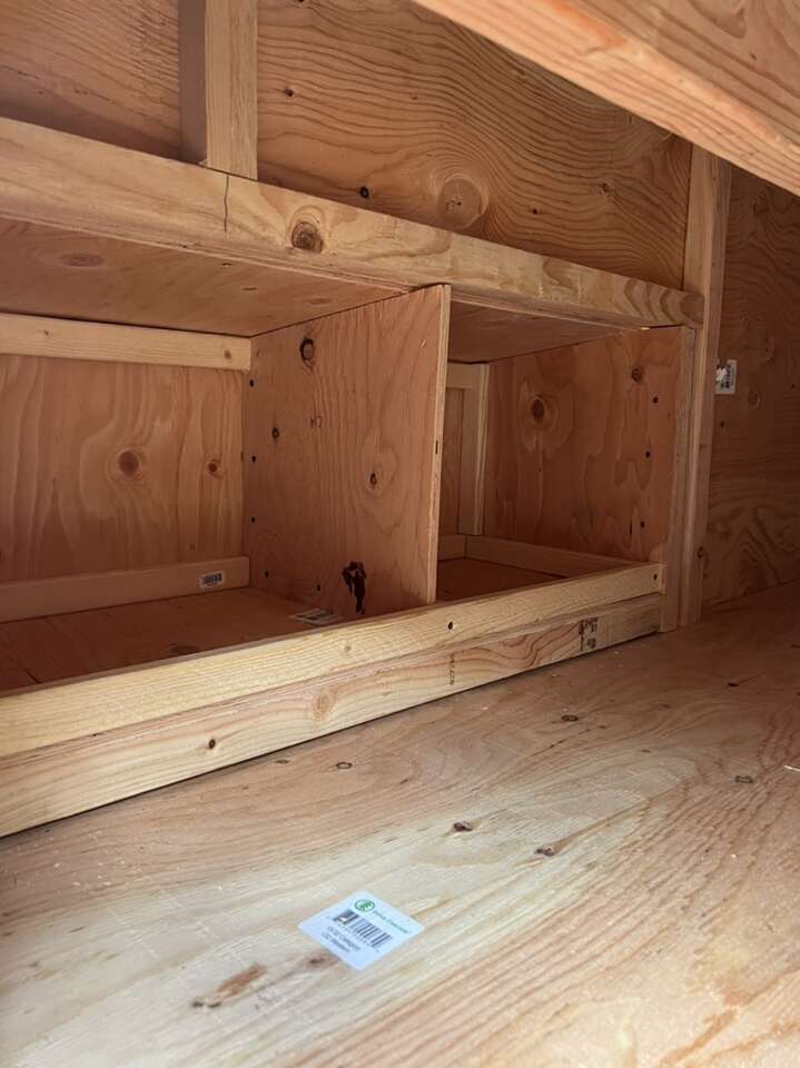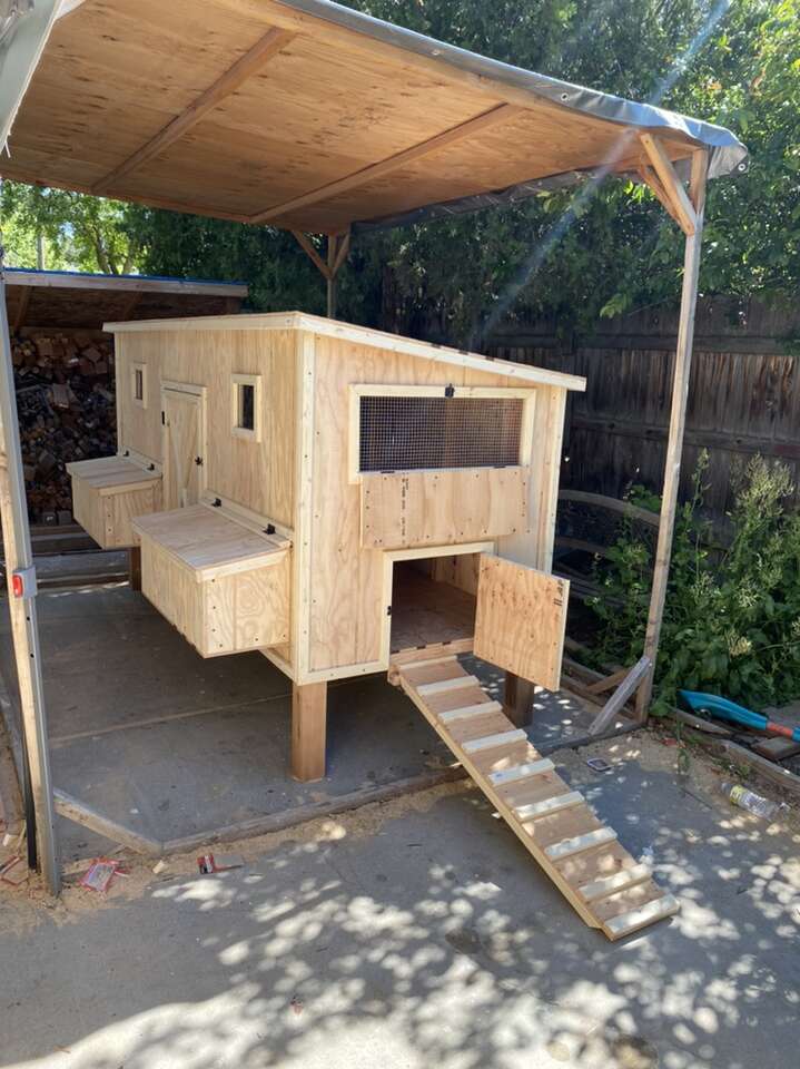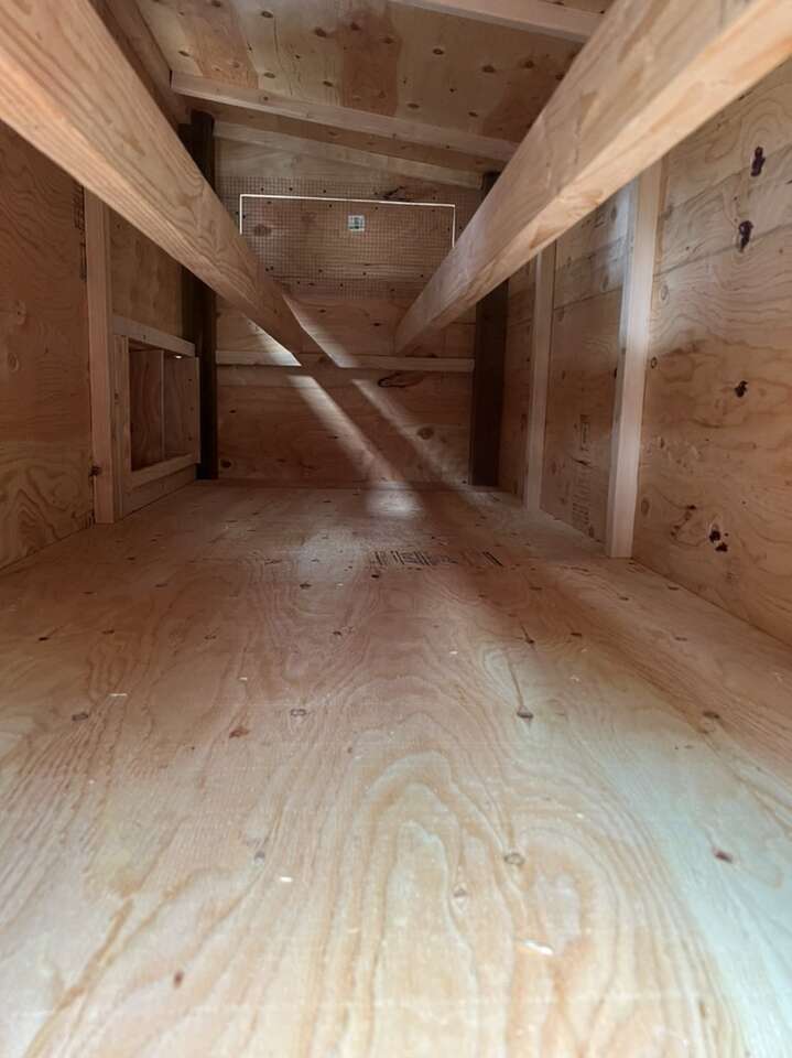 It includes: • 2 nesting boxes with 4 nesting/egg laying spots • 2 big ventilation Windows on each side • 2 doors to access the eggs • Two roosting sticks • 1 (16in x 16in) chicken access door • 1 (3.5ft x 2ft) large human access door/cleaning door • Made from new plywood(it lasts a lot longer than OSB) •Hardware cloth behind the ventilation windows to keep the animals out
